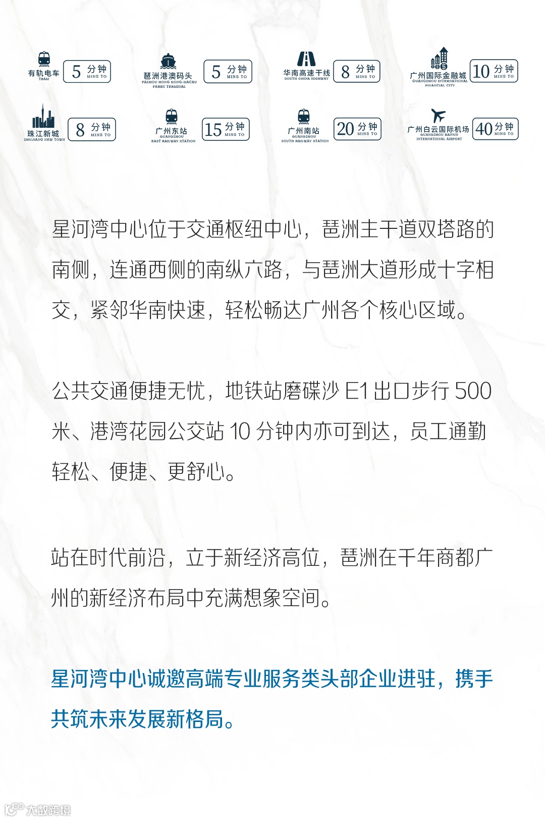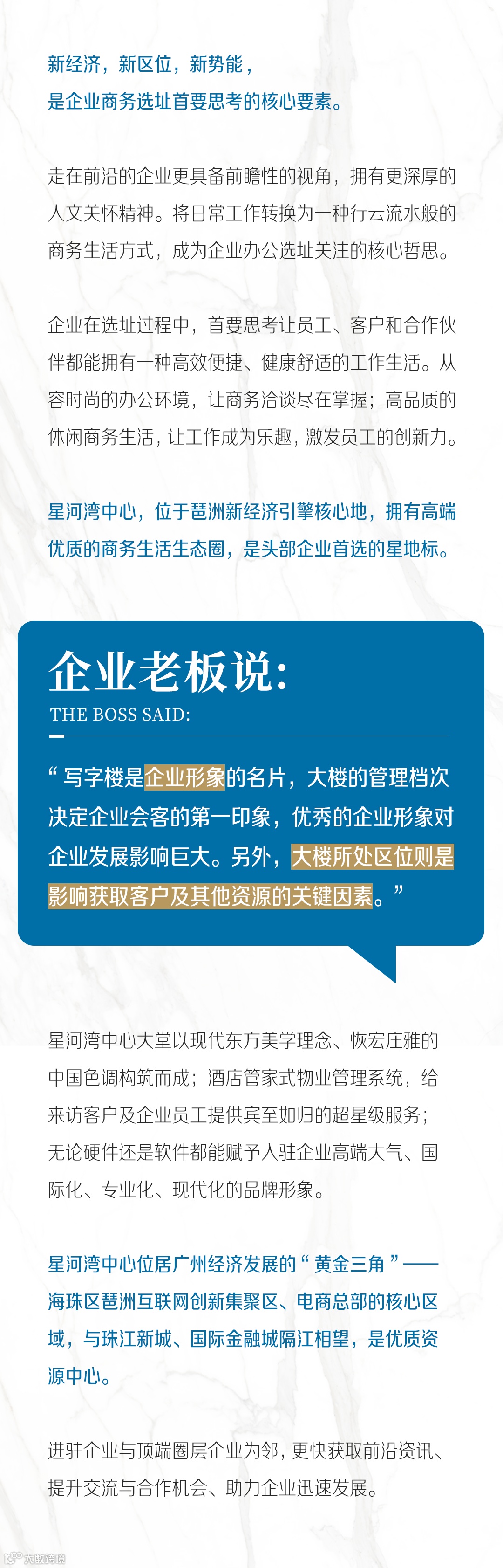 星河湾中心,位于大湾区新经济发展引擎——广州琶洲互联网创新集聚区,是星河湾集团集20多年城市建设、城市大服务及智慧应用经验之大成,以“舍得、用心、创新”价值观打造的首座超甲级写字楼,以东方美学与智慧科技为媒,诠释智能商务新场景。
