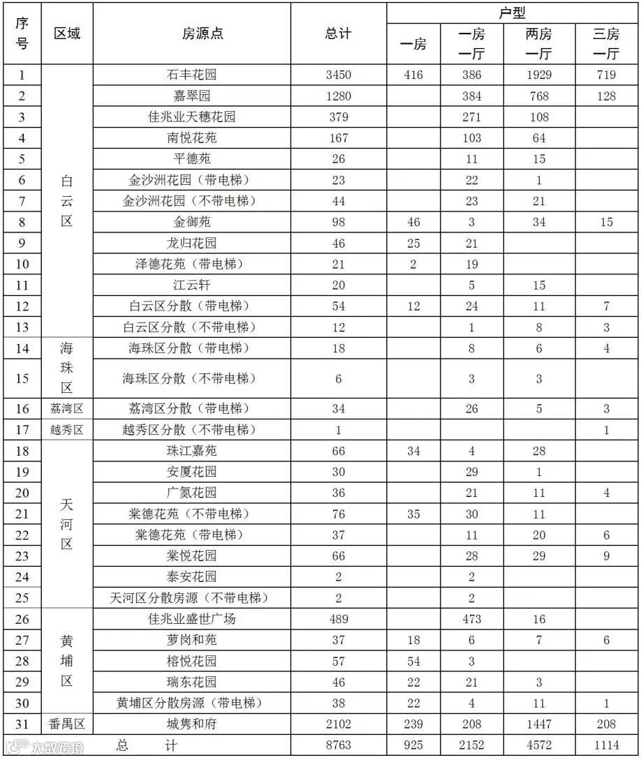 注:各房源租金标准、最新的物管费可查阅《广州市2021年户籍家庭公共租赁住房摇号分配指引》。