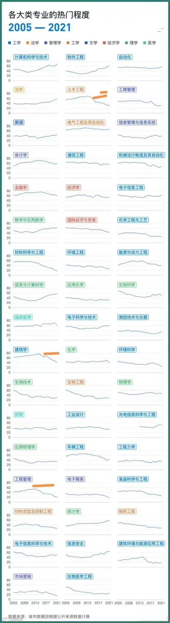 导读:附《2005-2021年各大专业热门程度走势图》