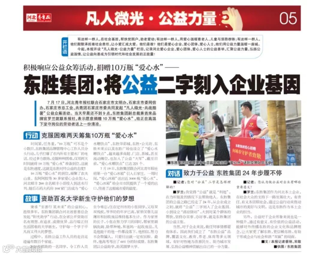 7月17日早晨6点,河北青年报社联合石家庄市文明办、石家庄市委网信办、石家庄市总工会、共青团石家庄市委共同发起“凡人微光·共战酷暑”公益众筹活动。当天早晨不到9点,东胜集团副总裁兼首席品牌官罗兰就联系报社,表示愿意捐赠10万瓶矿泉水,给正在高温下坚守岗位的劳动者送上一份清凉。