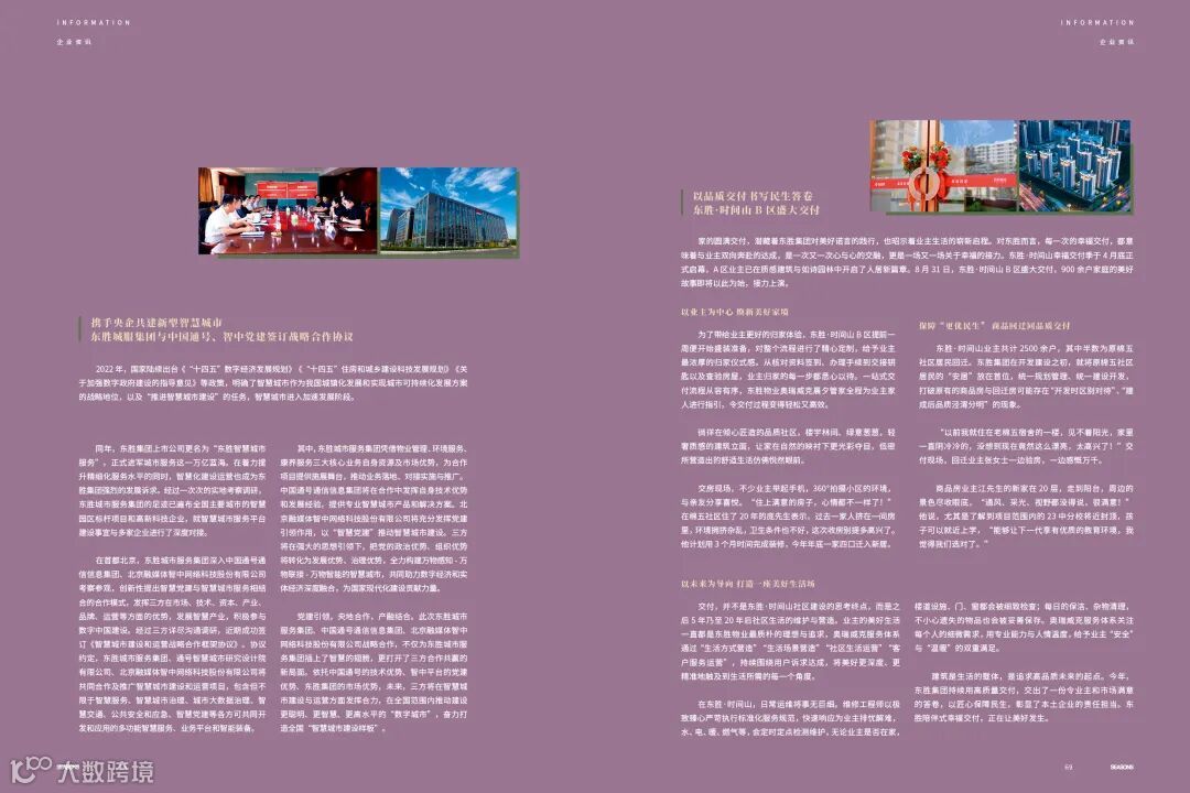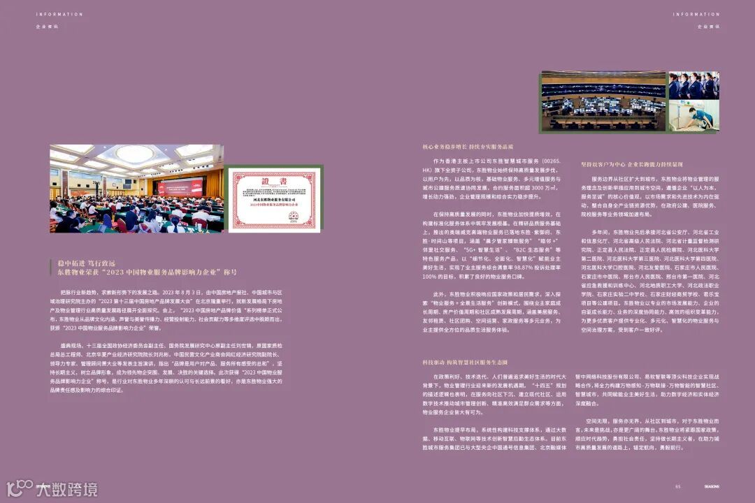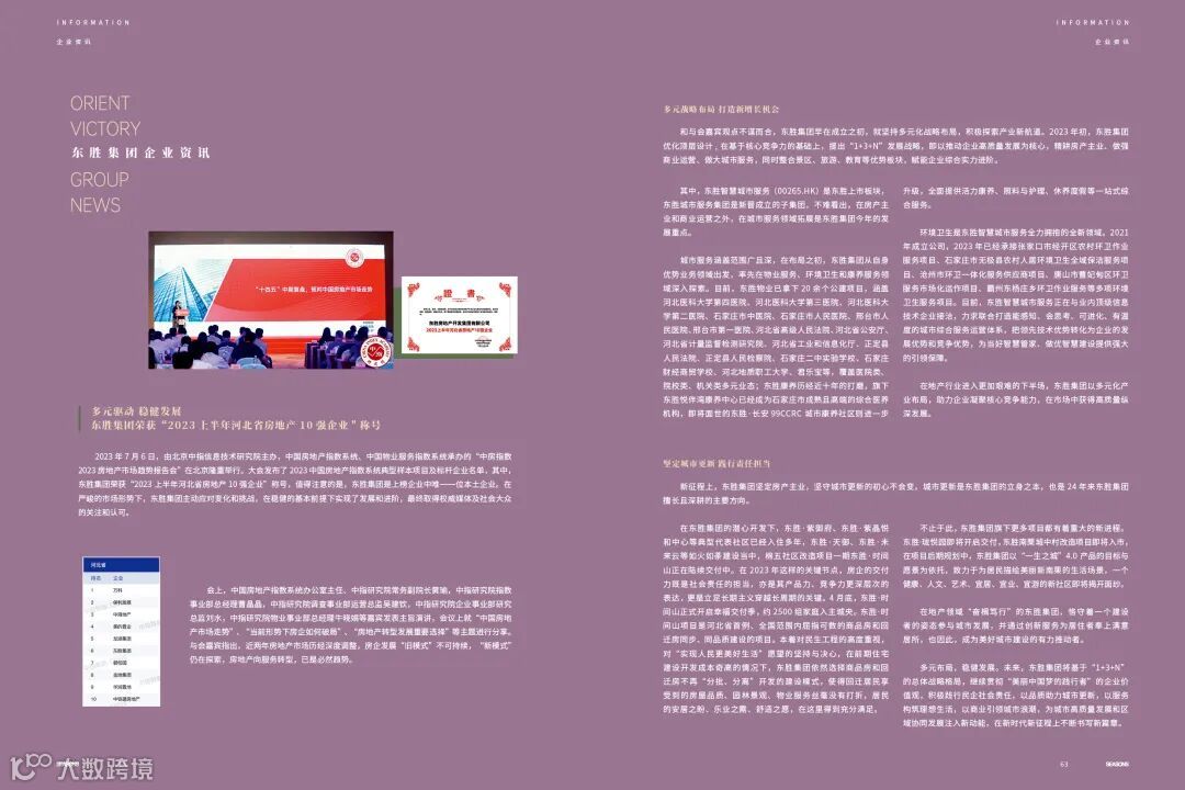 开拓进取,实力更强。2023 年,东胜集团再度升维行业使命和能级,明确落地“1+3+N”发展战略,以前瞻性的城市理念与视野,更多元的参与到城市服务与运营之中。立足燕赵版图,响应京津冀城市大发展、大机遇的战略规划,东胜集团踏上更高的起点为全面建设社会主义现代化国家探路。