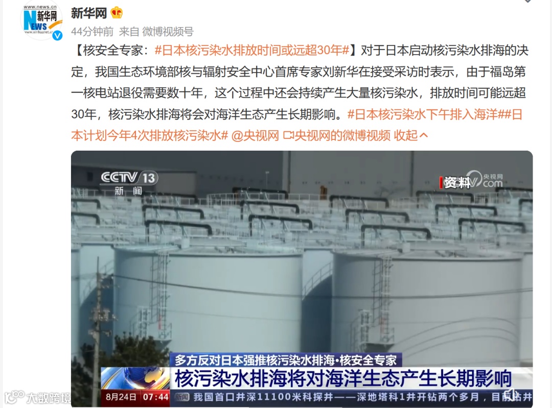 对于日本启动核污染水排海的决定,我国生态环境部核与辐射安全中心首席专家刘新华在接受采访时表示,由于福岛第一核电站退役需要数十年,这个过程中还会持续产生大量核污染水,排放时间可能远超30年,核污染水排海将会对海洋生态产生长期影响。