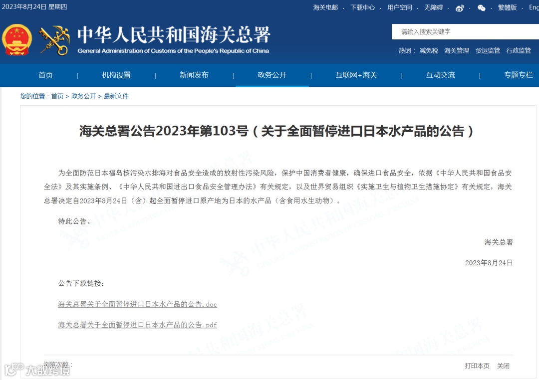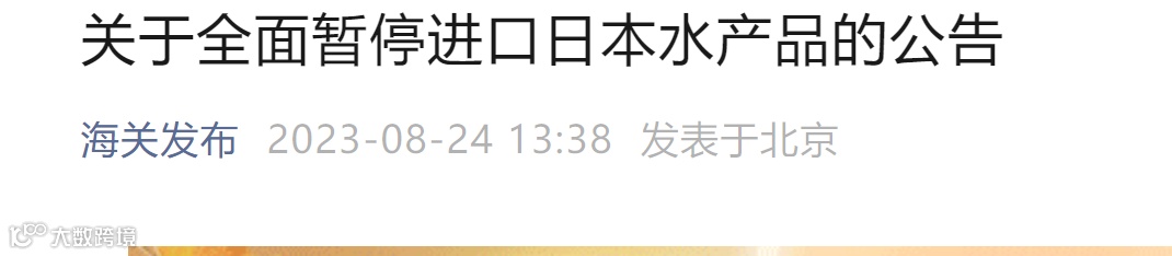 8月24日,海关总署发布公告:全面暂停进口日本水产品。