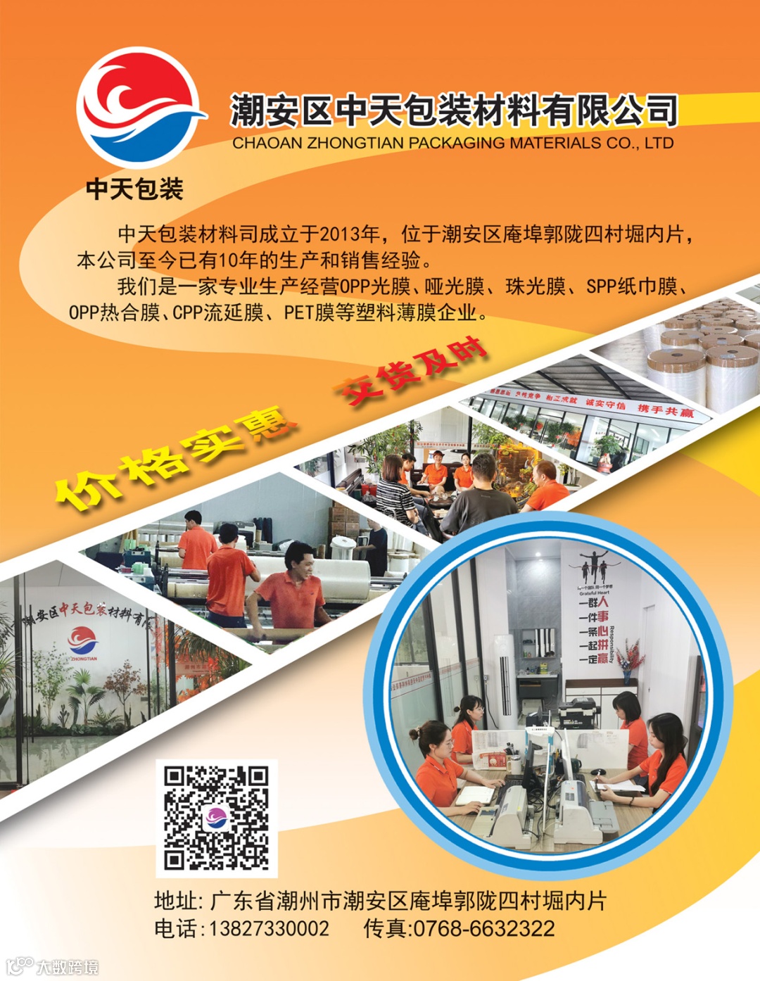 中天包装材料司成立于2013年,位于潮安区庵埠郭陇四村堀内片,本公司至今已有10年的生产和销售经验。