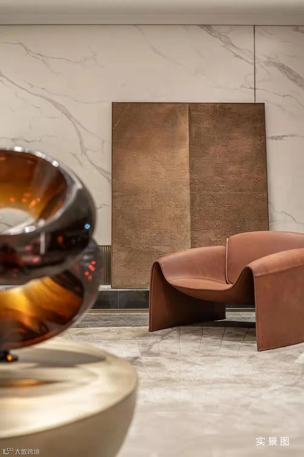 东胜·天御,建筑面积约200平米样板间内,室内的软装陈列通过浓重的艺术化,表现出BV的高雅与内敛低调奢华,安静陈列在客厅的REFLEX意大利大型沙发,以及富有线条感的茶几、B&B 的单椅,均体现出了空间的现代高贵感;就连茶几摆件也以艺术属性彰显着主人的品味。