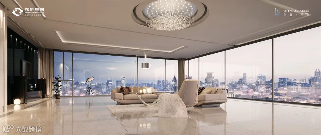 与传统270°瞰景空间不同,东胜·天御窗景结构做了创新,突破传统意义的环幕瞰景视野,超高的窗墙比,接近地面的超大玻璃环幕,将观景视野做到了极致。