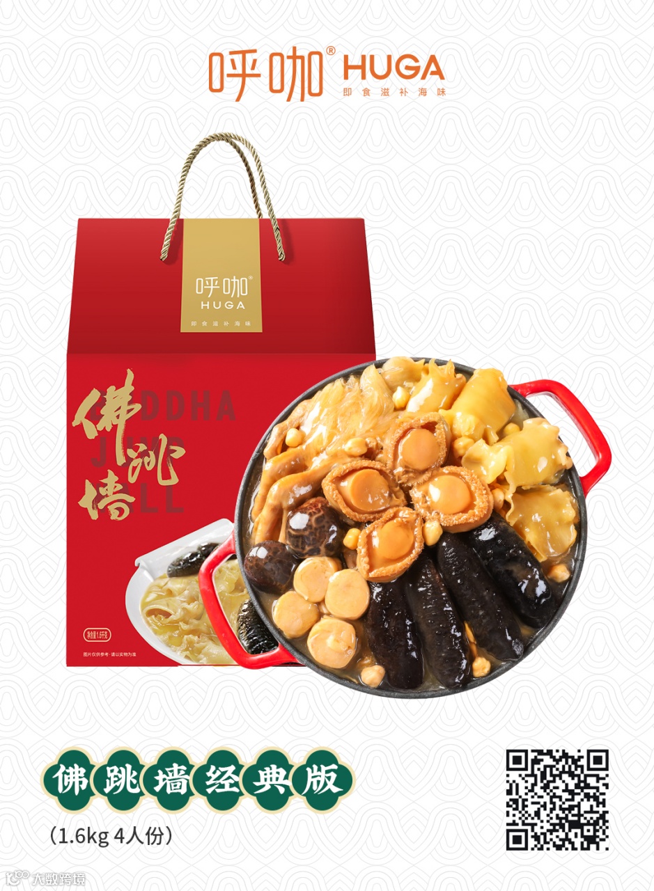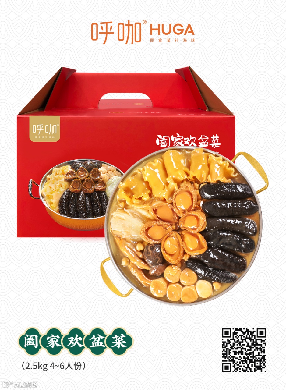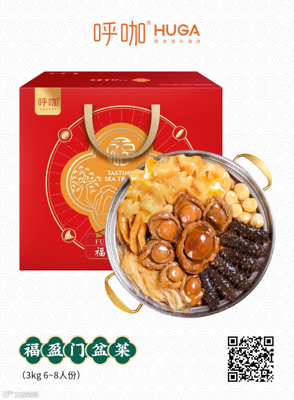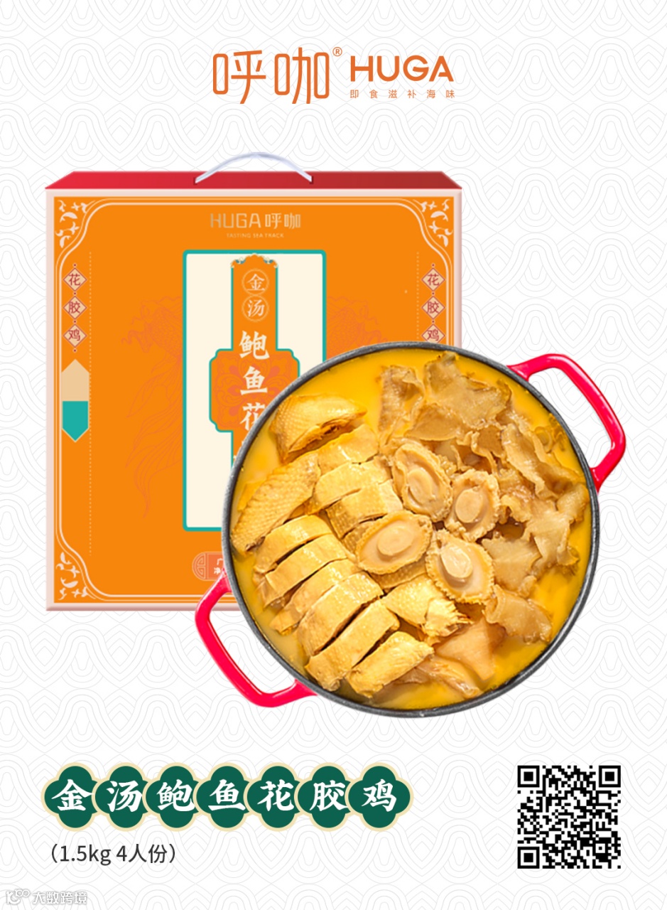 呼咖HUGA系列高级速冻即食滋补品由广州托尼可食品有限公司研发,该系列产品把鲍参翅肚等高档滋补品进行了烹饪技法创新,精选天然深海海味,将古代养生良方和现代高新烹饪工艺结合,制成充满岭南特色的传统美味佳肴,包括佛跳墙、大盆菜、海参粥、浓汤翅、五谷花胶等等。