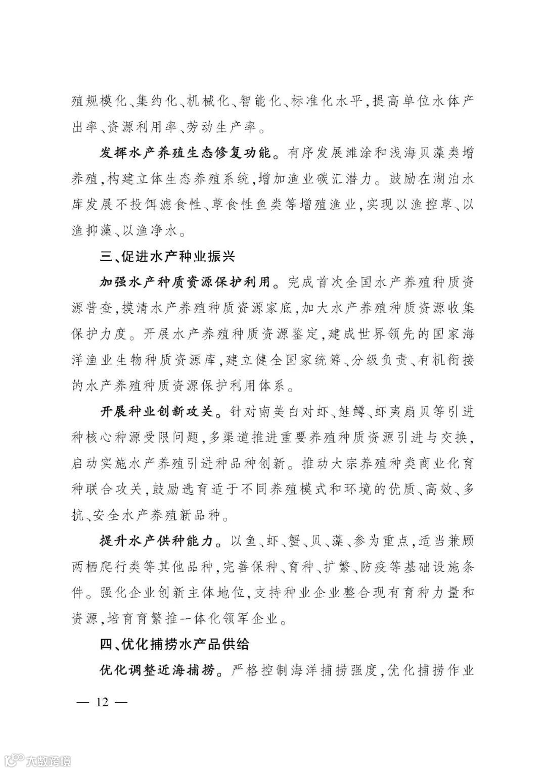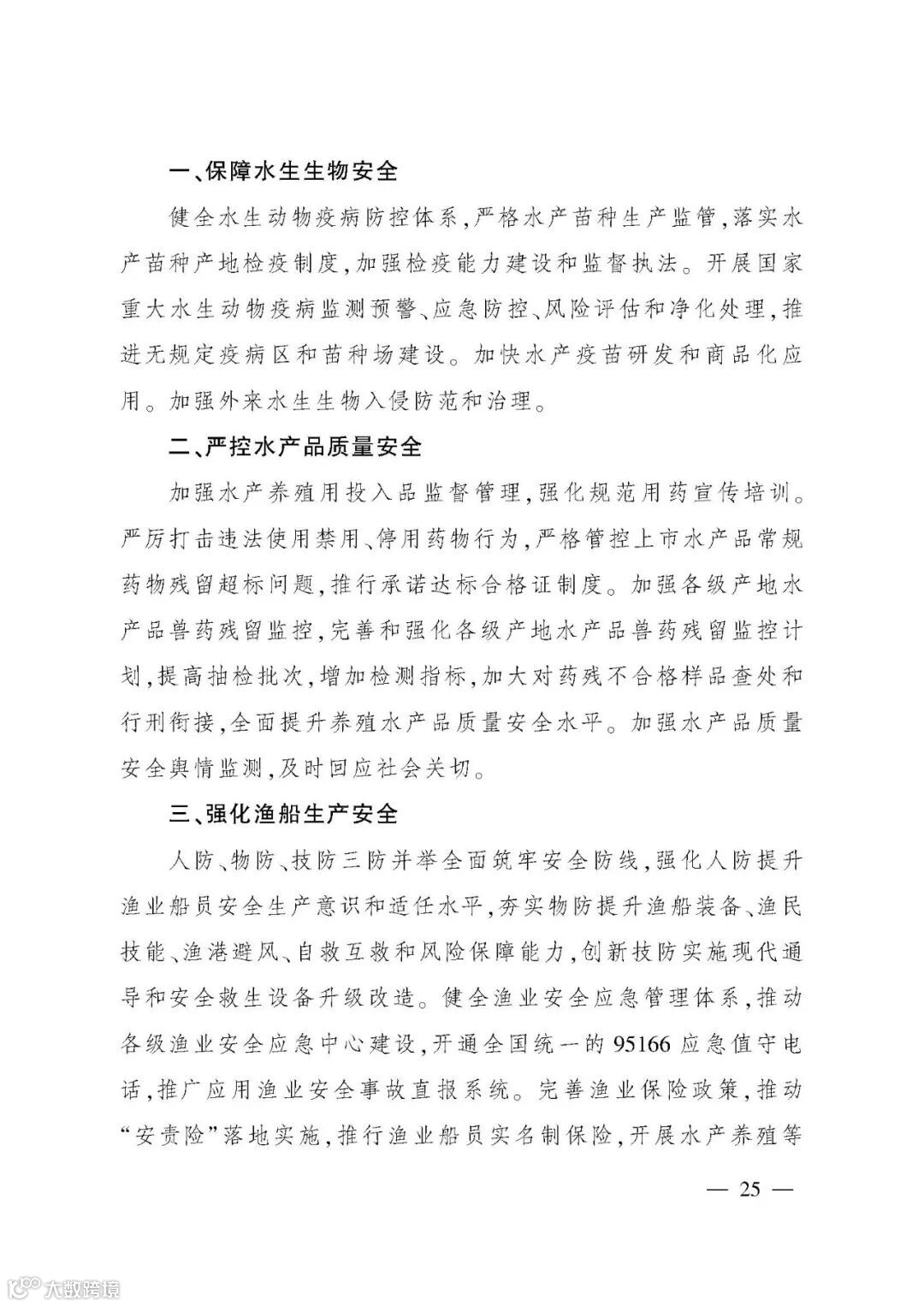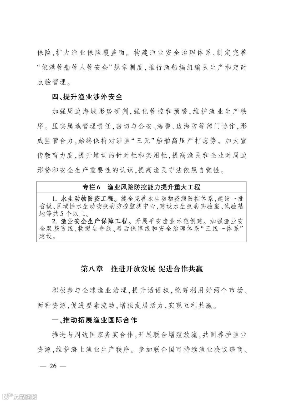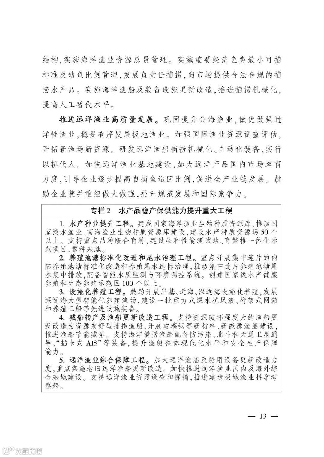 《规划》提出“三提升、三促进”的“十四五”渔业发展重点任务,并以专栏形式规划了12项重大工程。一是夯实渔业生产基础,提升水产品稳产保供水平。坚持把保障水产品供给作为渔业发展第一要务,稳定水产养殖面积,推进绿色健康养殖,促进水产种业振兴,优化捕捞水产品供给。二是推进产业融合发展,提升渔业产业现代化水平。提升水产品加工流通,培育壮大多种业态,加强水产品市场拓展,推进产业集聚发展。三是强化渔业改革创新,提升行业治理水平。强化渔业科技,推进渔船渔港管理改革,提高渔业生产组织化程度,加强渔政执法。四是持续加强以长江为重点的水生生物保护,促进渔业资源可持续利用。扎实推进长江“十年禁渔”,加强水生生物资源养护,提升水生野生动物保护水平。五是强化渔业风险防控,促进渔业安全发展。保障水生生物安全,严控水产品质量安全,强化渔船生产安全,提升渔业涉外安全。六是推进开放发展,促进合作共赢。推动拓展渔业国际合作,持续提升国际履约能力,鼓励水产养殖业“走出去”。