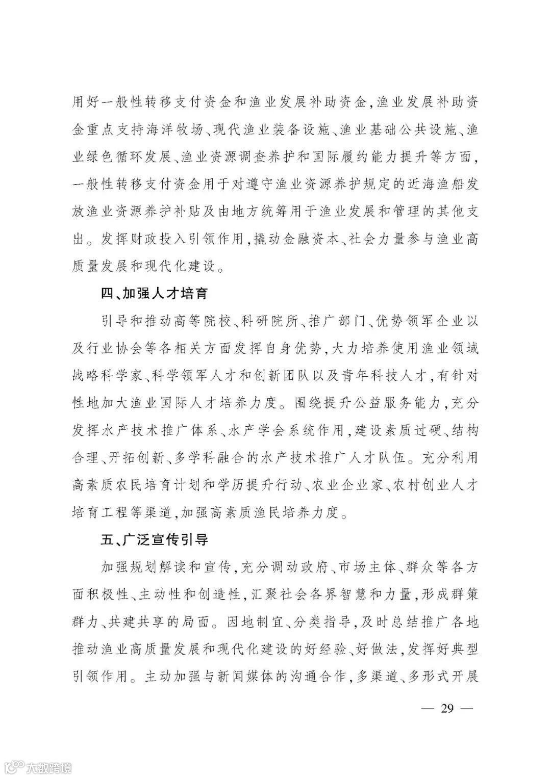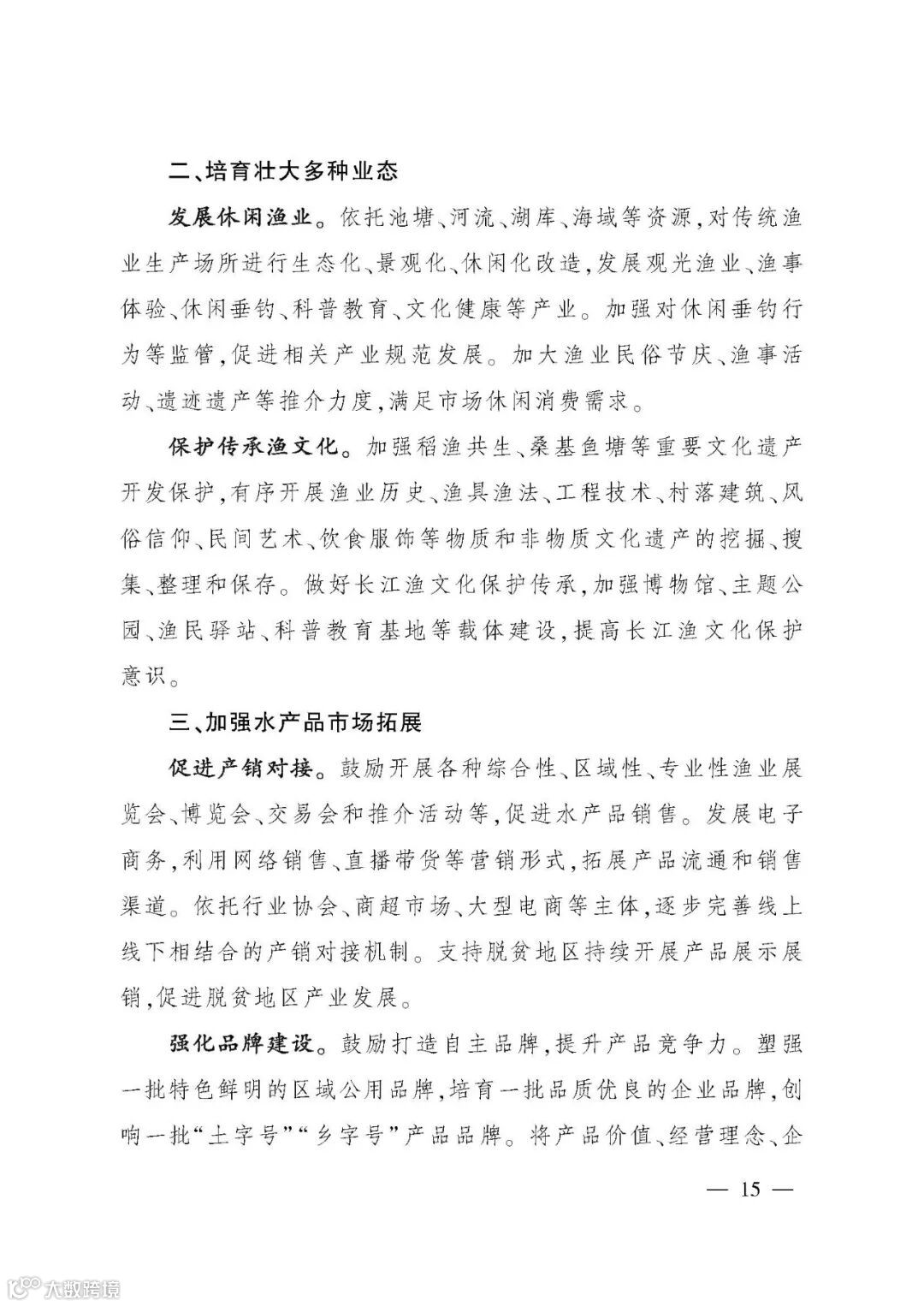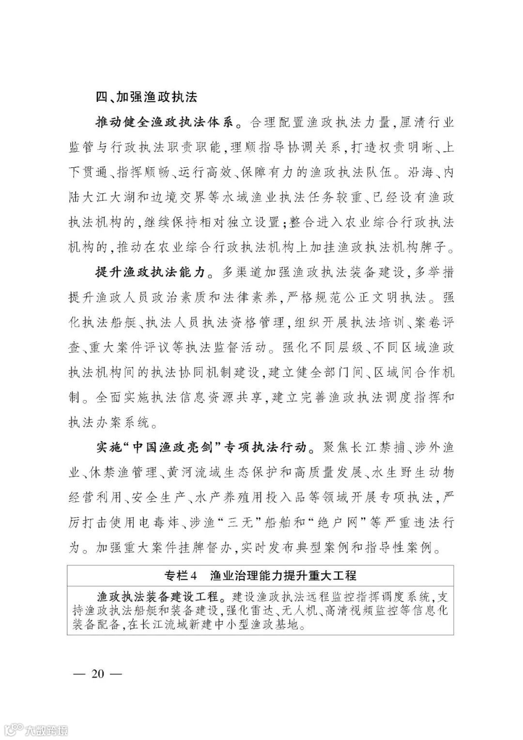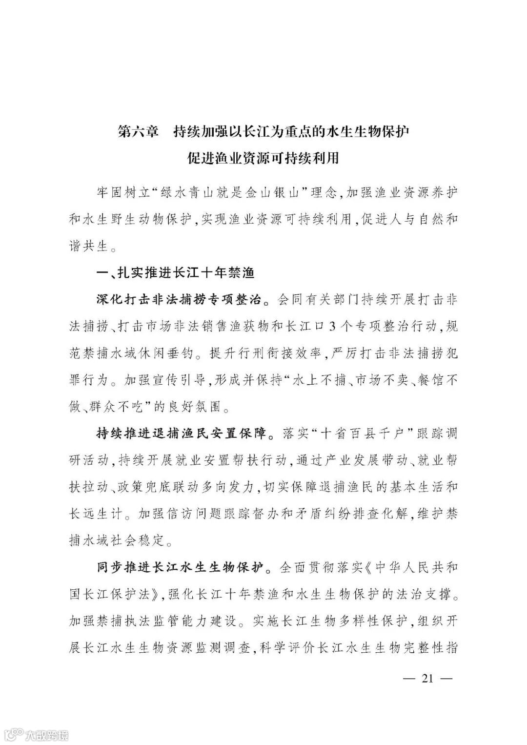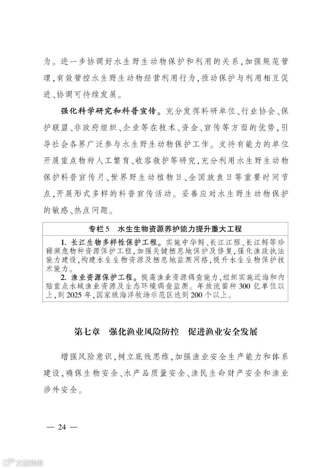 《规划》提出“三提升、三促进”的“十四五”渔业发展重点任务,并以专栏形式规划了12项重大工程。一是夯实渔业生产基础,提升水产品稳产保供水平。坚持把保障水产品供给作为渔业发展第一要务,稳定水产养殖面积,推进绿色健康养殖,促进水产种业振兴,优化捕捞水产品供给。二是推进产业融合发展,提升渔业产业现代化水平。提升水产品加工流通,培育壮大多种业态,加强水产品市场拓展,推进产业集聚发展。三是强化渔业改革创新,提升行业治理水平。强化渔业科技,推进渔船渔港管理改革,提高渔业生产组织化程度,加强渔政执法。四是持续加强以长江为重点的水生生物保护,促进渔业资源可持续利用。扎实推进长江“十年禁渔”,加强水生生物资源养护,提升水生野生动物保护水平。五是强化渔业风险防控,促进渔业安全发展。保障水生生物安全,严控水产品质量安全,强化渔船生产安全,提升渔业涉外安全。六是推进开放发展,促进合作共赢。推动拓展渔业国际合作,持续提升国际履约能力,鼓励水产养殖业“走出去”。