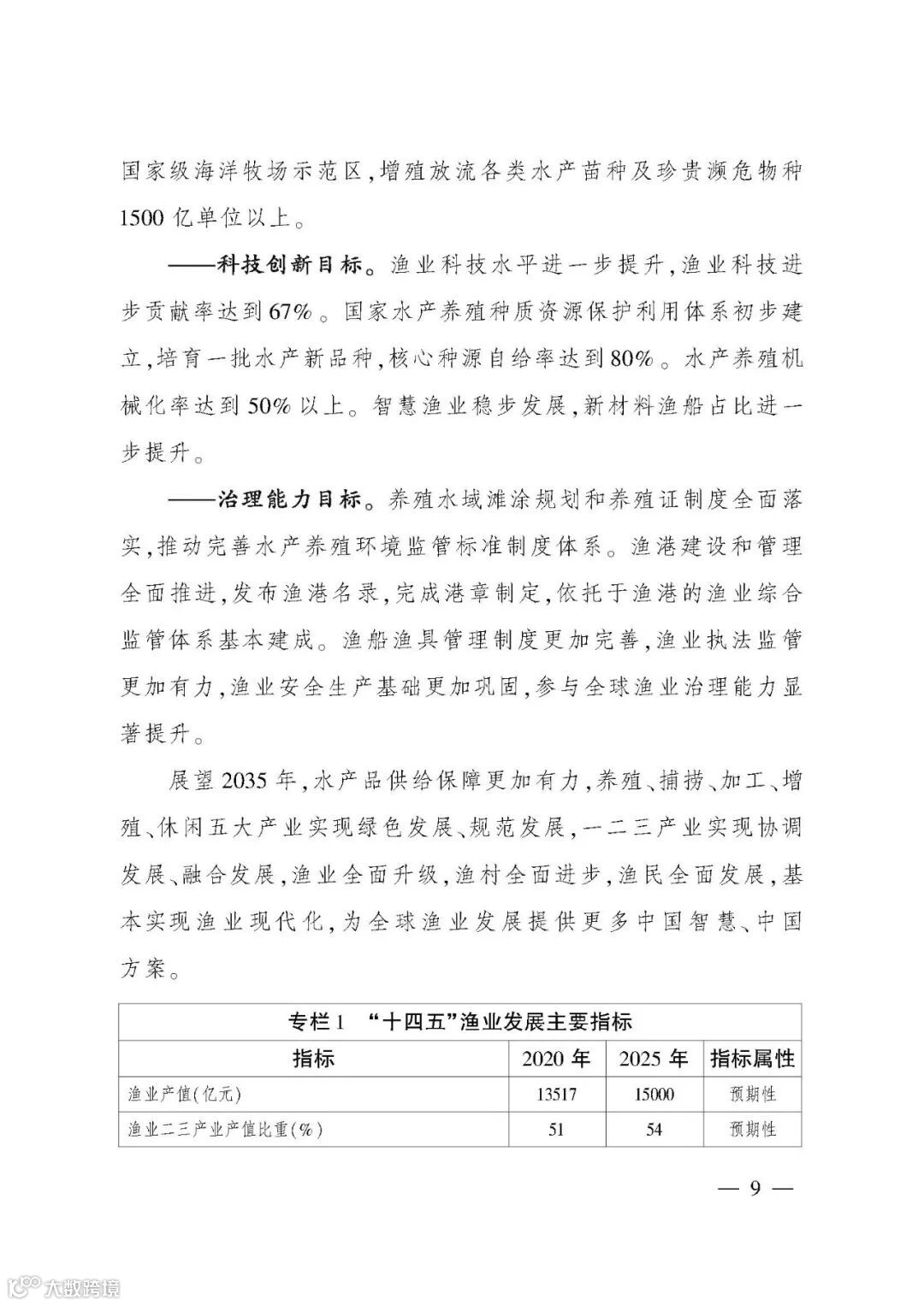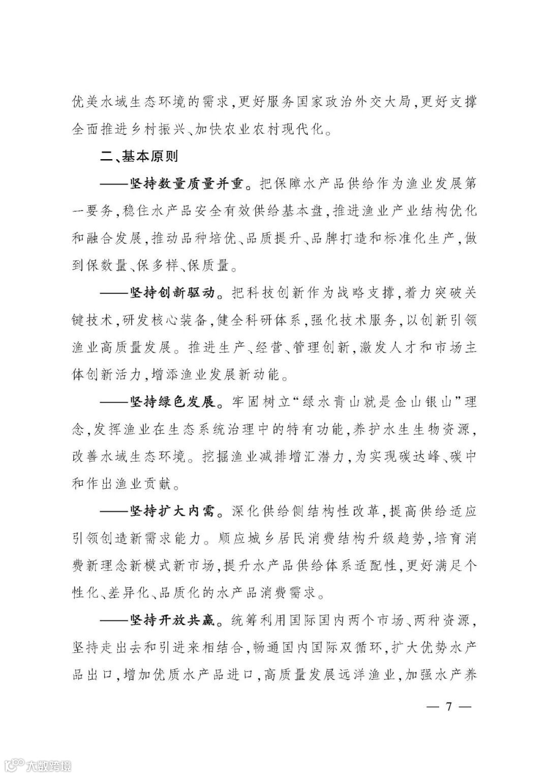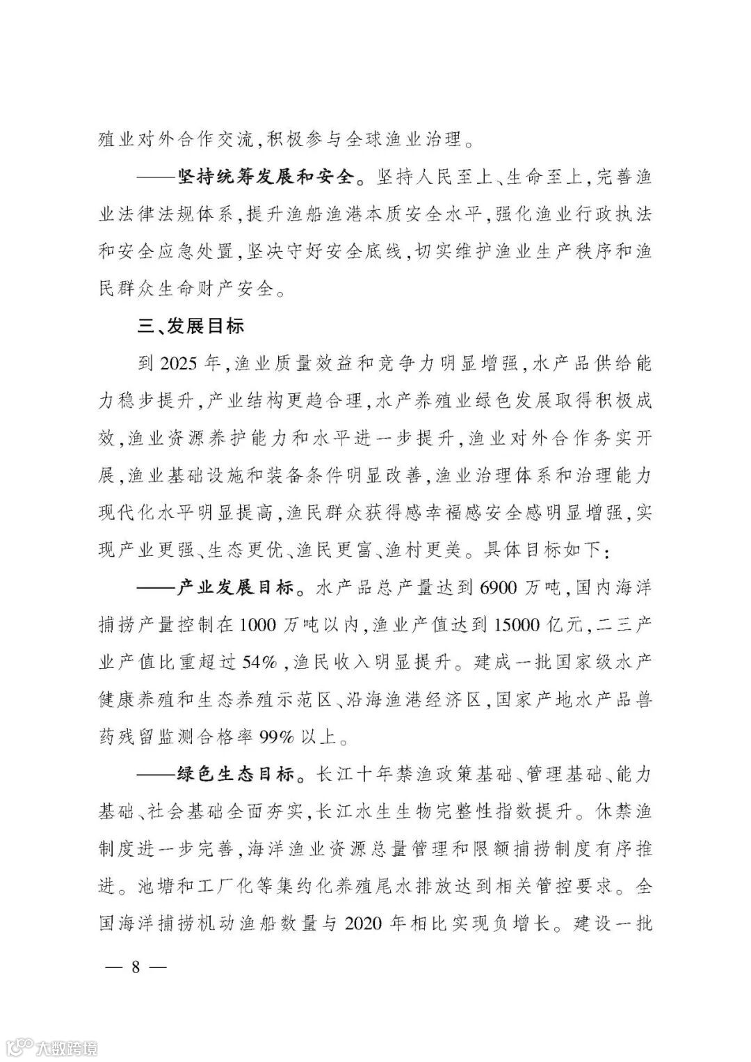 《规划》提出,“十四五”期间,将坚持“稳产保供、创新增效、绿色低碳、规范安全、富裕渔民”的工作思路,坚持数量质量并重、创新驱动、绿色发展、扩大内需、开放共赢、统筹发展和安全的基本原则,推进渔业高质量发展,统筹推动渔业现代化建设。具体提出渔业产业发展、绿色生态、科技创新、治理能力四个方面12项指标,力争到2035年基本实现渔业现代化。