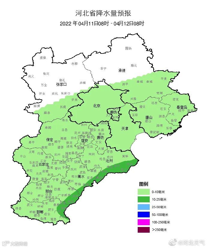 今天白天到夜间,张家口北部、承德北部阴转多云,其他地区阴有小雨或零星小雨,其中沧州、衡水、邢台、邯郸四个地区的东部有中雨。