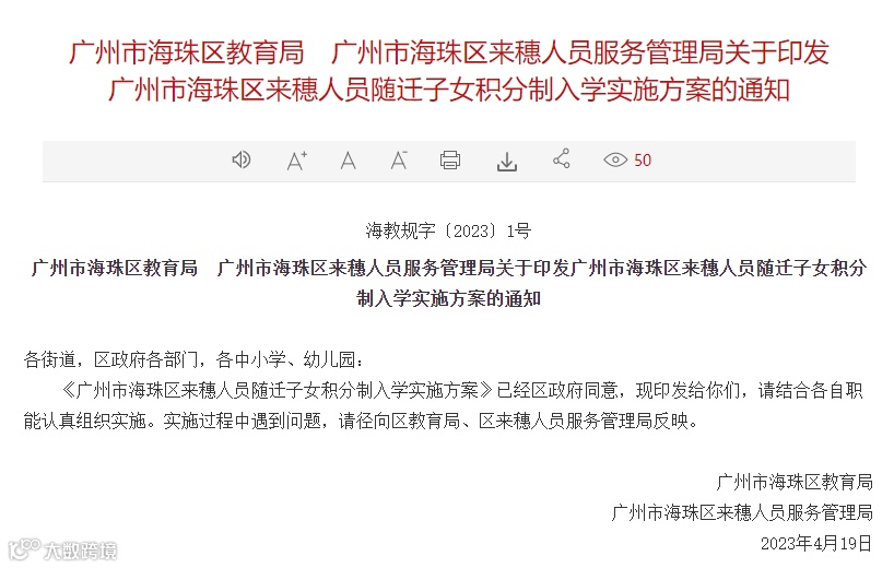 番禺发布2023年来穗人员随迁子女积分制入学申请工作办理提醒