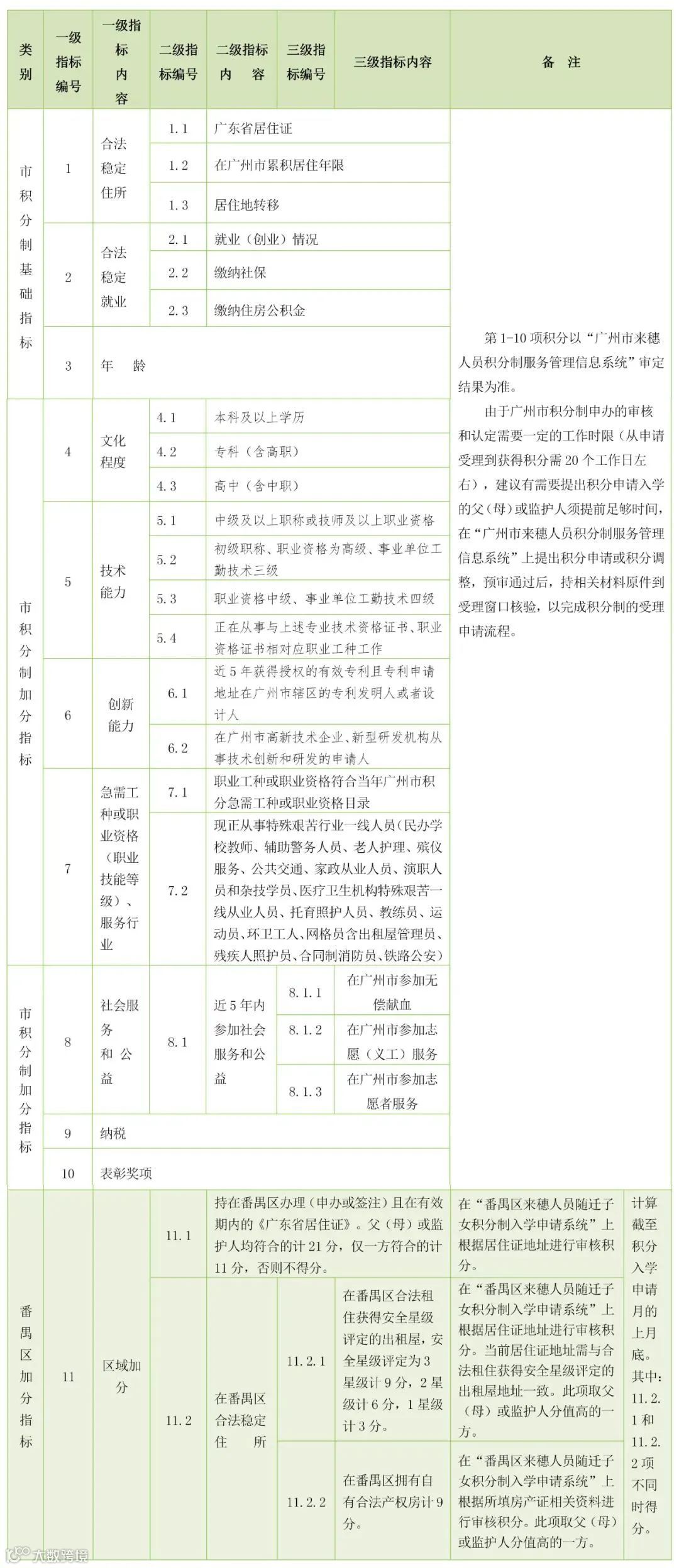 四、根据《广州市人民政府关于印发广州市来穗人员积分制服务管理规定(试行)的通知》及其实施细则要求,各区在广州市来穗人员积分制指标体系之外,补充不超过30分的加分指标。本积分项目第1项至第10项需父(母)或监护人提前在“广州市来穗人员积分制服务管理信息系统 ”上提出积分申请。第11项为番禺区区域加分项,需父(母)或监护人在“番禺区来穗人员随迁子女积分制入学申请系统”上提出加分申请。