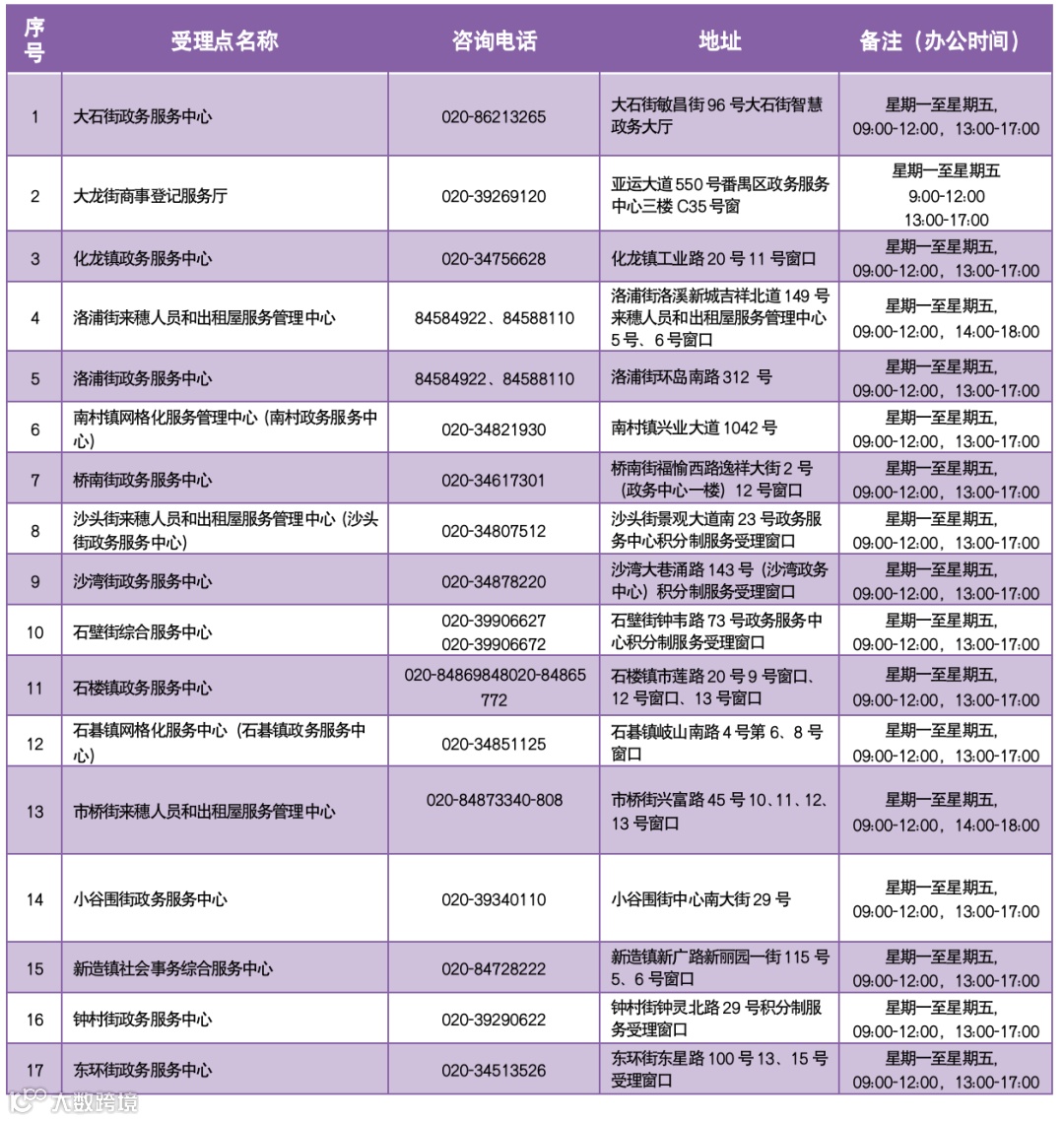 番禺区积分制服务受理网点一览表