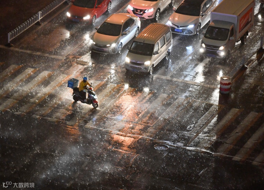 2021年4月15日傍晚,在天津市南开区,外卖骑手在风雨中骑行过马路。新华社发(孙凡越 摄)