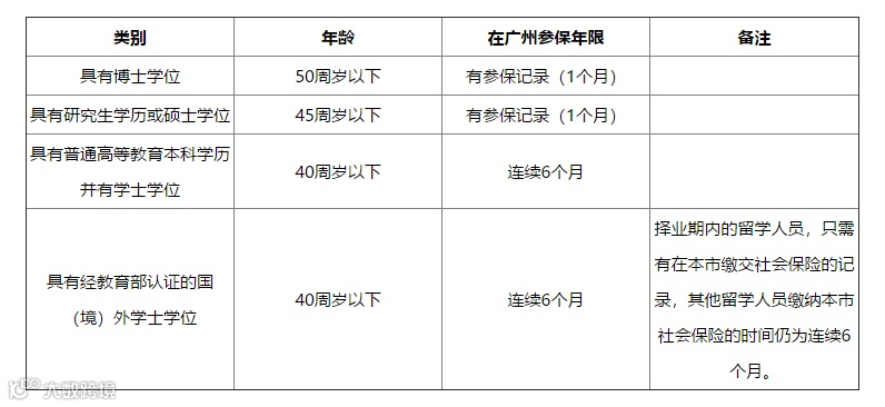 (四)具有国内普通高校全日制大学本科学历并有学士学位,或具有国(境)外学士学位,或具有中级职称的人员,年龄需在40周岁以下,申办时须在省或广州市社保经办机构连续缴纳社保满6个月。