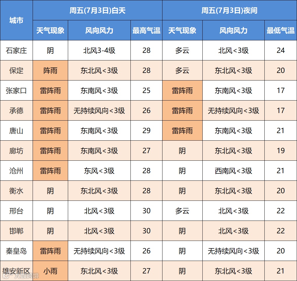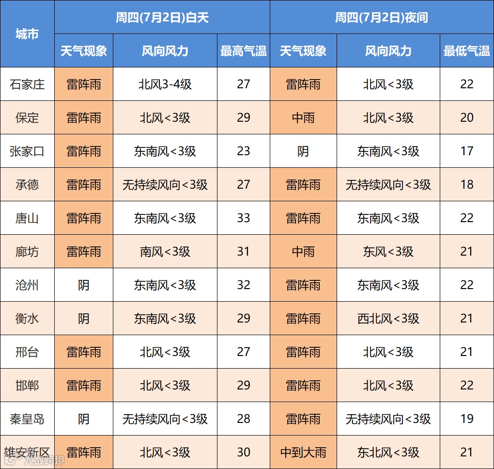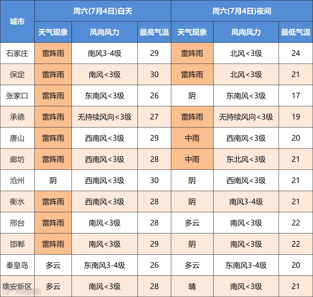 河北省气象台预计,7月2日至4日,河北多雷阵雨或阵雨天气,部分地区有中雨,局地大雨,并伴有短时强降水等强对流天气。6月28日