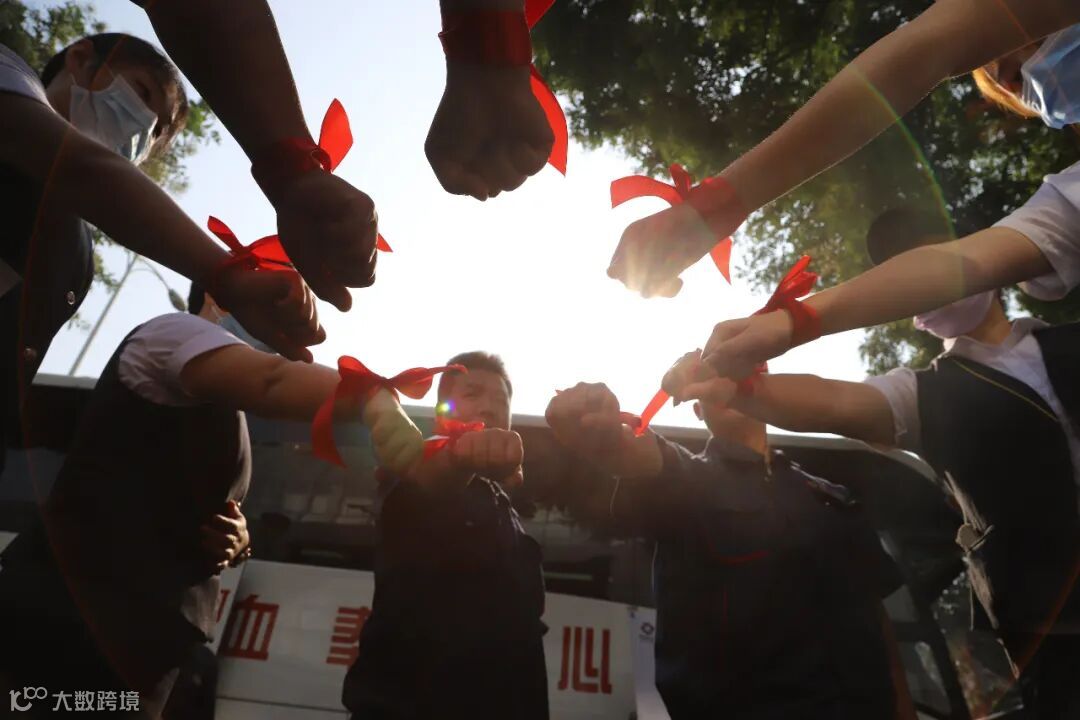 红色丝巾系在手腕,这是一种爱心的象征,也是一股力量的体现。阳光之下,热血汇集,爱心凝聚;如一滴雨,催一束花;此一滴血,护一个TA。生命的暖流在传递,也为东胜人的精神品格写下生动的注脚。