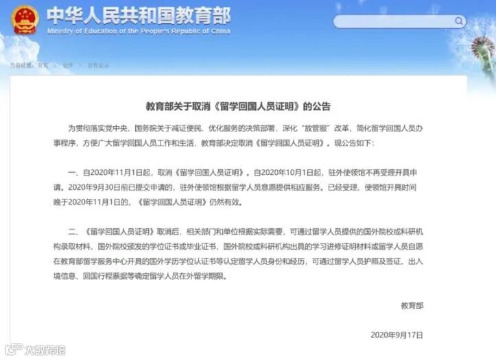 教育部将取消《留学回国人员证明》