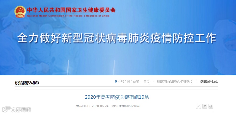 国家卫健委官网6月24日发布《2020年高考防疫关键措施10条》,措施包括提前14天进行日常体温测量、考点入口处设体温检测点以及设置备用考场等。
