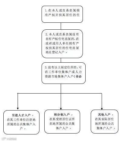 提醒:不同类型入户人员的落户地址是不同的,应先按规定顺序(详见以下示意图)提供有关证明以确定登记入户地址。