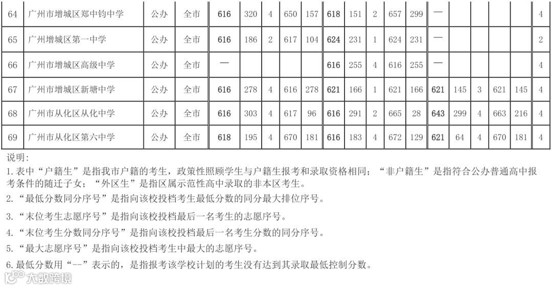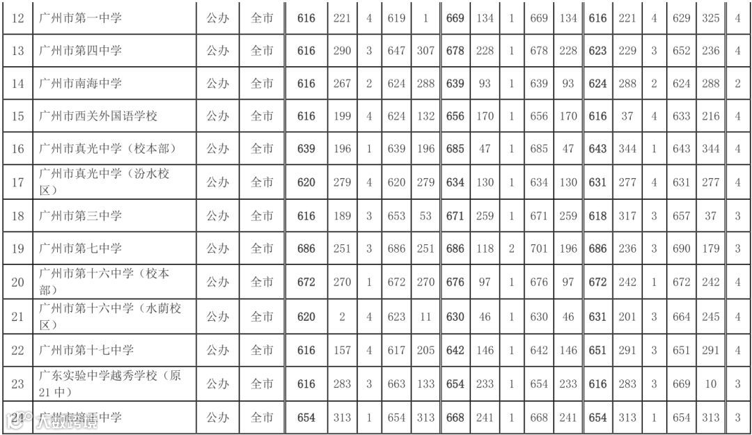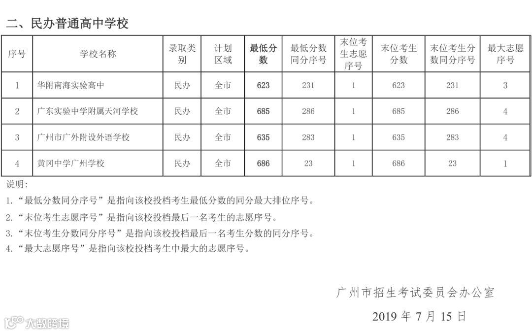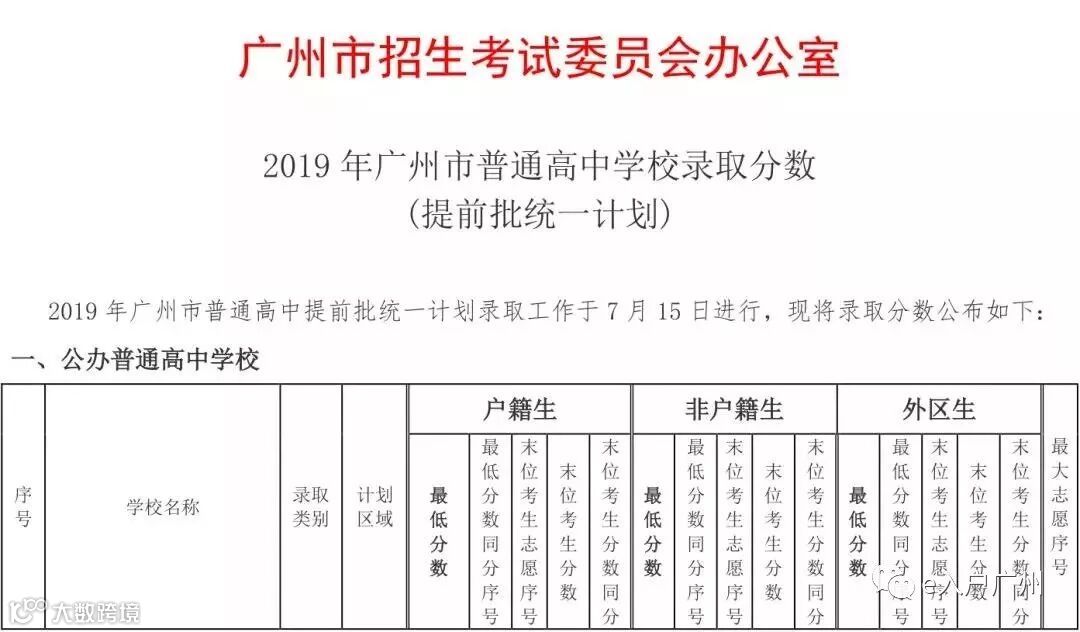 7月15日,广州市招生考试委员会办公室公布2019年广州普通高中提前批录取分数,提前批,录取的是示范性高中,排名靠前的学校,本年度提前批中,广州户籍的学生跟非广州户籍的学生,录取分数最高相差72分,1分拉开的排名差距可能是1人,也可能是几十人,而72分,则可以将你推出名校,拉开的不仅仅是高中门槛,足以改变一生的发展方向。录取分数线具体明细如下: