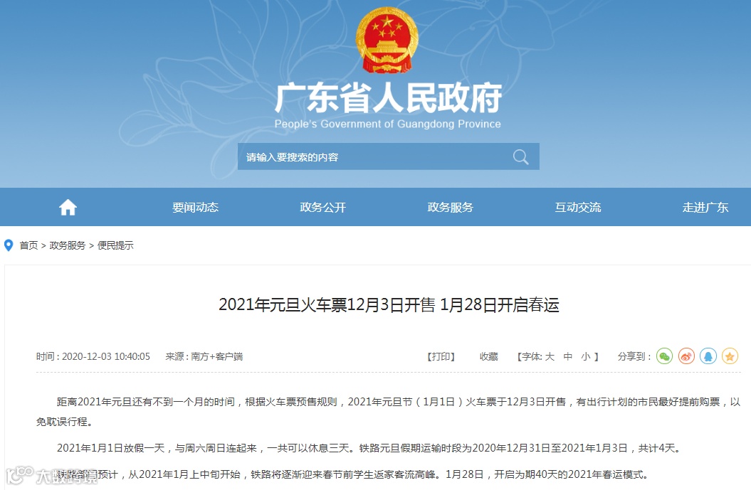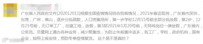 近日,某网站发布了一篇《广东省2021春运取消》的文章,称有一份“广东省人民政府文件”表示:“根据全国疫情情况结合我省情况,2021年春运取消。”还煞有介事地提到了“三步走放假”,第一步就是“学校12月15号前全部分批放假”。
