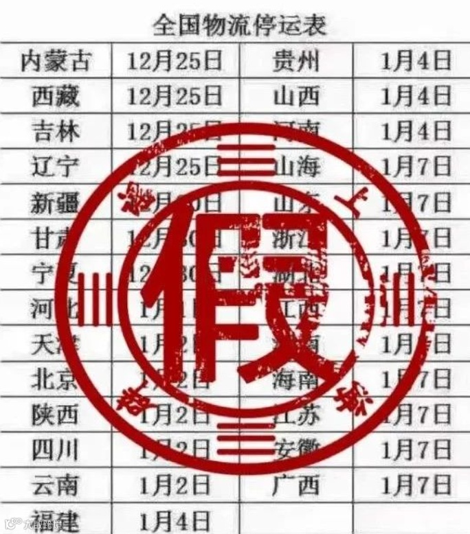 而每年1月和12月,“全国物流停运时间表”都会在网上热传。今年热传的所谓“时间表”也是根据历年传言拼凑嫁接的,和2021年春节假期完全不符。