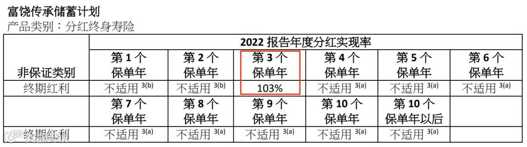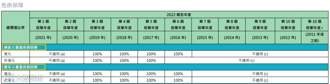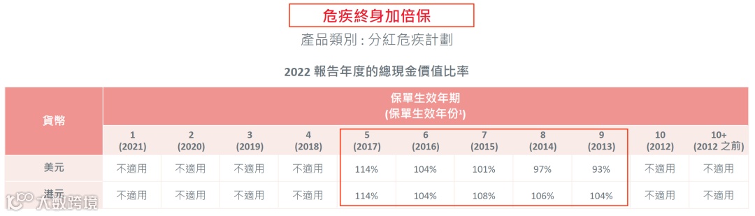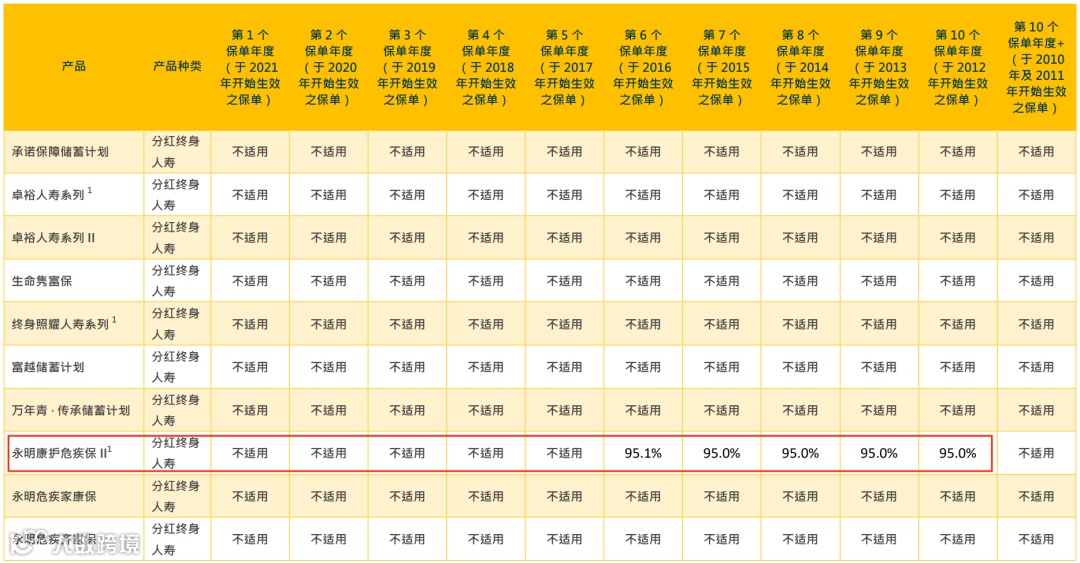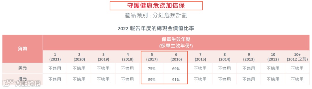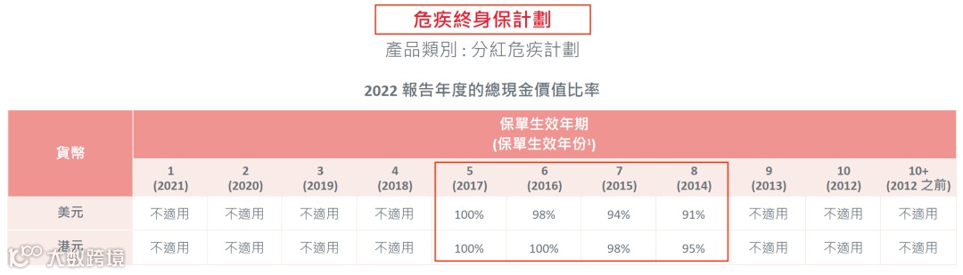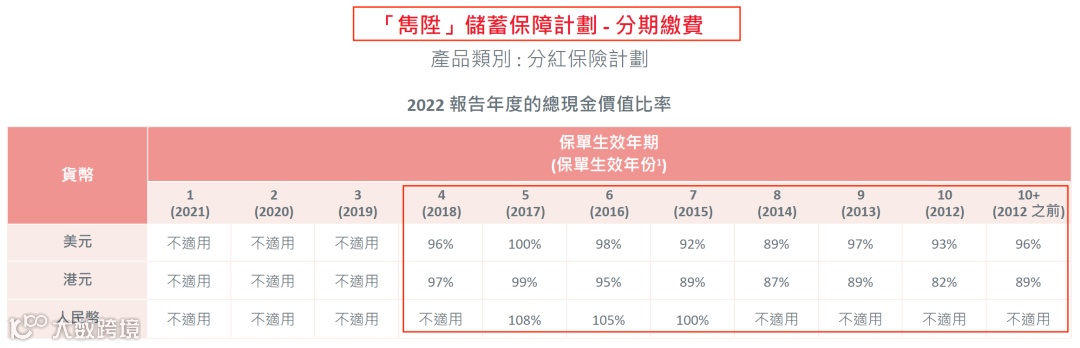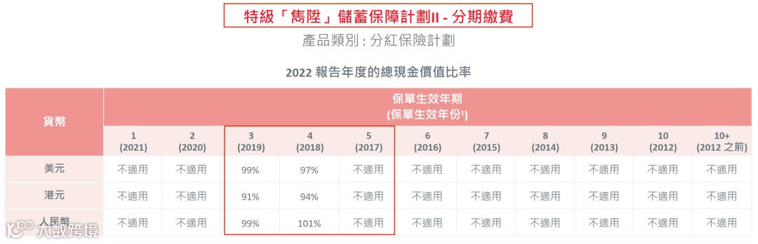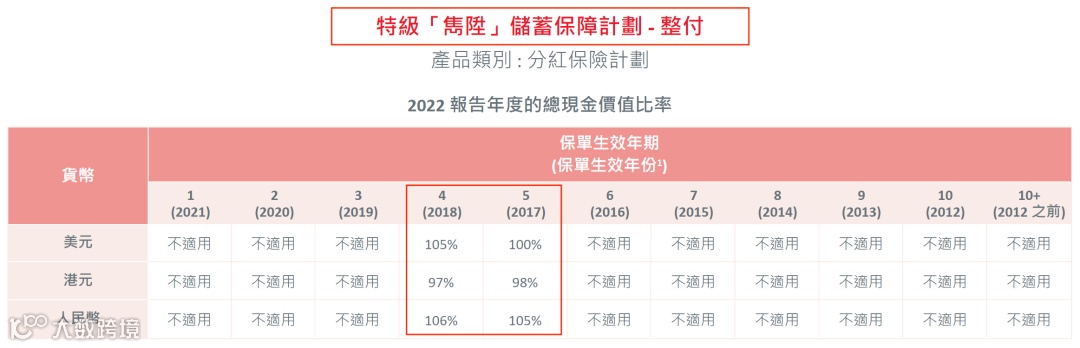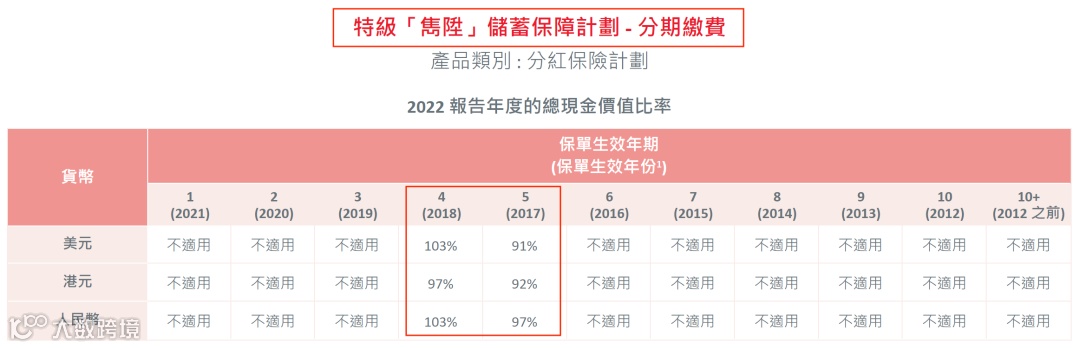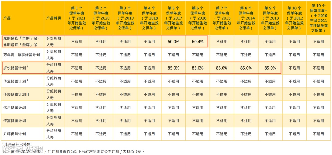 (说明:总现金价值是客户持有保单的真正价值, 周年红利和终期红利会受到各种因素的影响(比如提前退保、身故等影响)从而导致数据并不准确,有波动。对于持有保单的客户而言,直接参考“总现金价值比率“即可。)