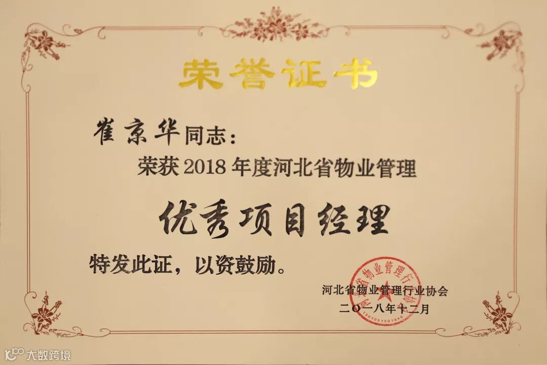 与此同时,东胜服务集团崔京华女士荣获“2018年度河北省物业管理优秀项目经理”称号。