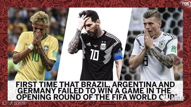 结束了两场重头戏,结果卫冕冠军德国爆冷0-1不敌墨西哥,巴西在库蒂尼奥进球之后看似一切顺利,但是最终被顽强的瑞士1-1逼平,加上此前阿根廷1-1战平冰岛,三支世界杯热门球队都没有能拿下开门红,这是世界杯历史上第一次巴西、德国和阿根廷同时都没赢下首战。