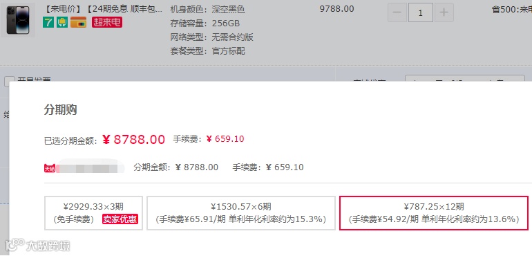 比如说我们都很喜欢的分期购物。一款手机,分期金额为8788元,使用12期分期购物,每期还款787.25元。