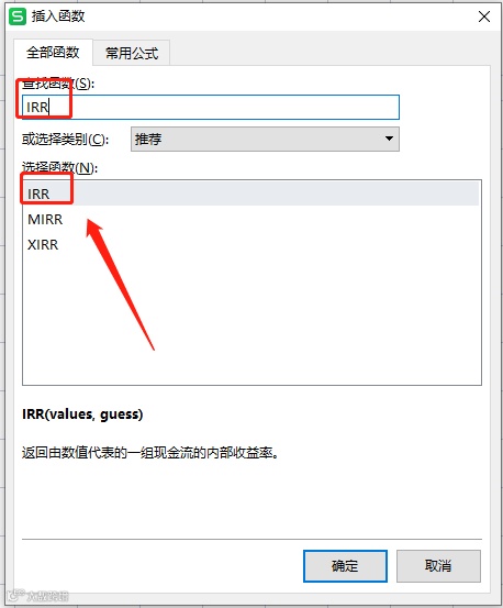 在搜索框输入【IRR】,选择下方出现的“IRR函数”。
