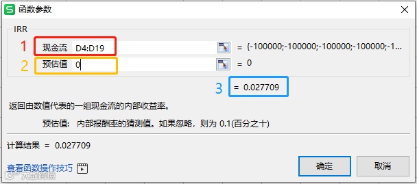 黄色框:代表的是“IRR的预估值”。(一般填0即可)由于计算机对此函数的计算次数有限,如果现金流太长,可能会导致算不出结果。所以在计算IRR时,要填上这个值来辅助计算。
