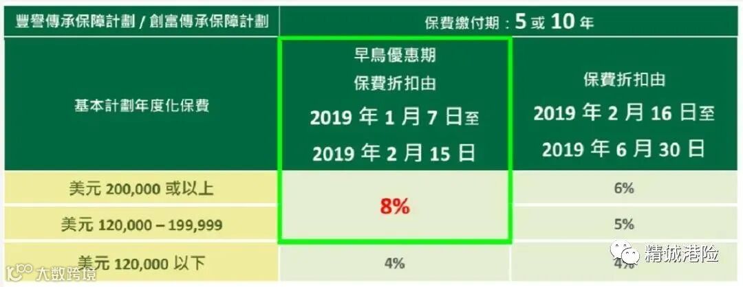 于推广期内,成功投保创富传承保障计划,可享高达基本计划的首年年度化保费8%之保费折扣优惠。保费折扣优惠将用作扣减合资格保单的首年保费。具体优惠信息如下: