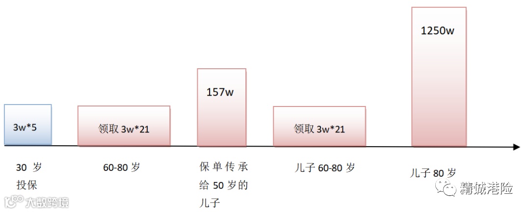 60岁的王先生开始退休环游世界,在60-80岁期间每年领取3万美金,到80岁的时候保单退保价值157万,他决定把保单传承给自己50岁的儿子。王先生的儿子跟父亲一样选择在60岁开始领取养老金,每年3万美金,一直领取到80岁。这时保单退保价值总额达到1250万美金,保单仍可以继续传承。