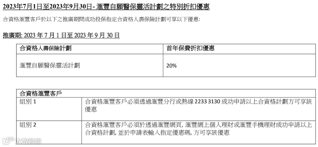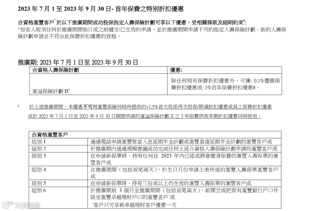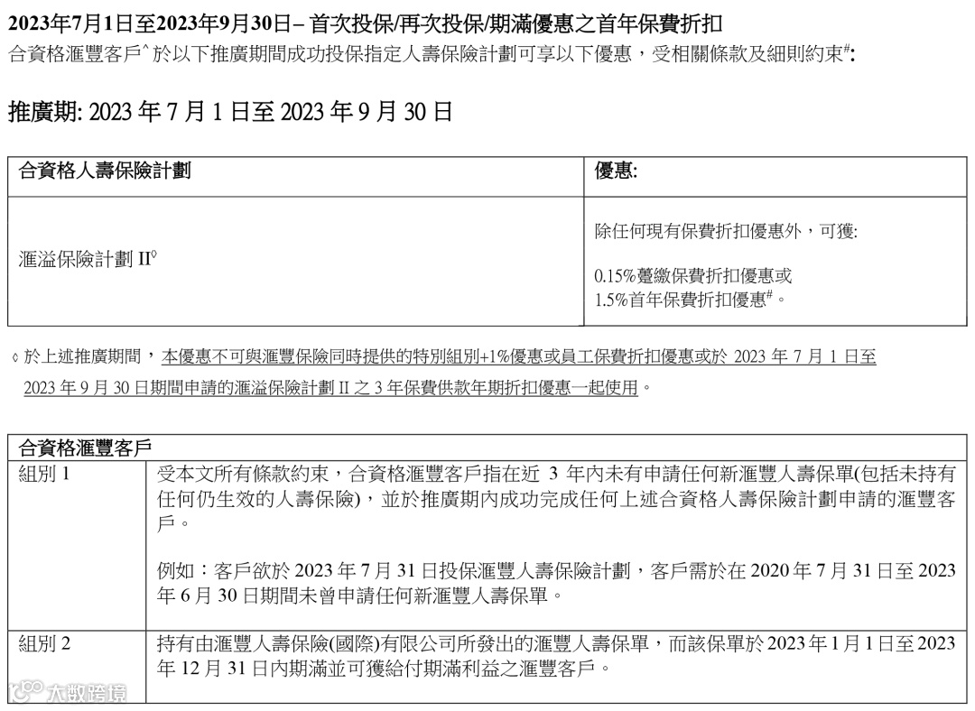 以下合资格汇丰客户投保「汇溢保险计划II」,额外享0.1%(趸缴)保费折扣优惠或1%(期缴)首年保费折扣优惠。