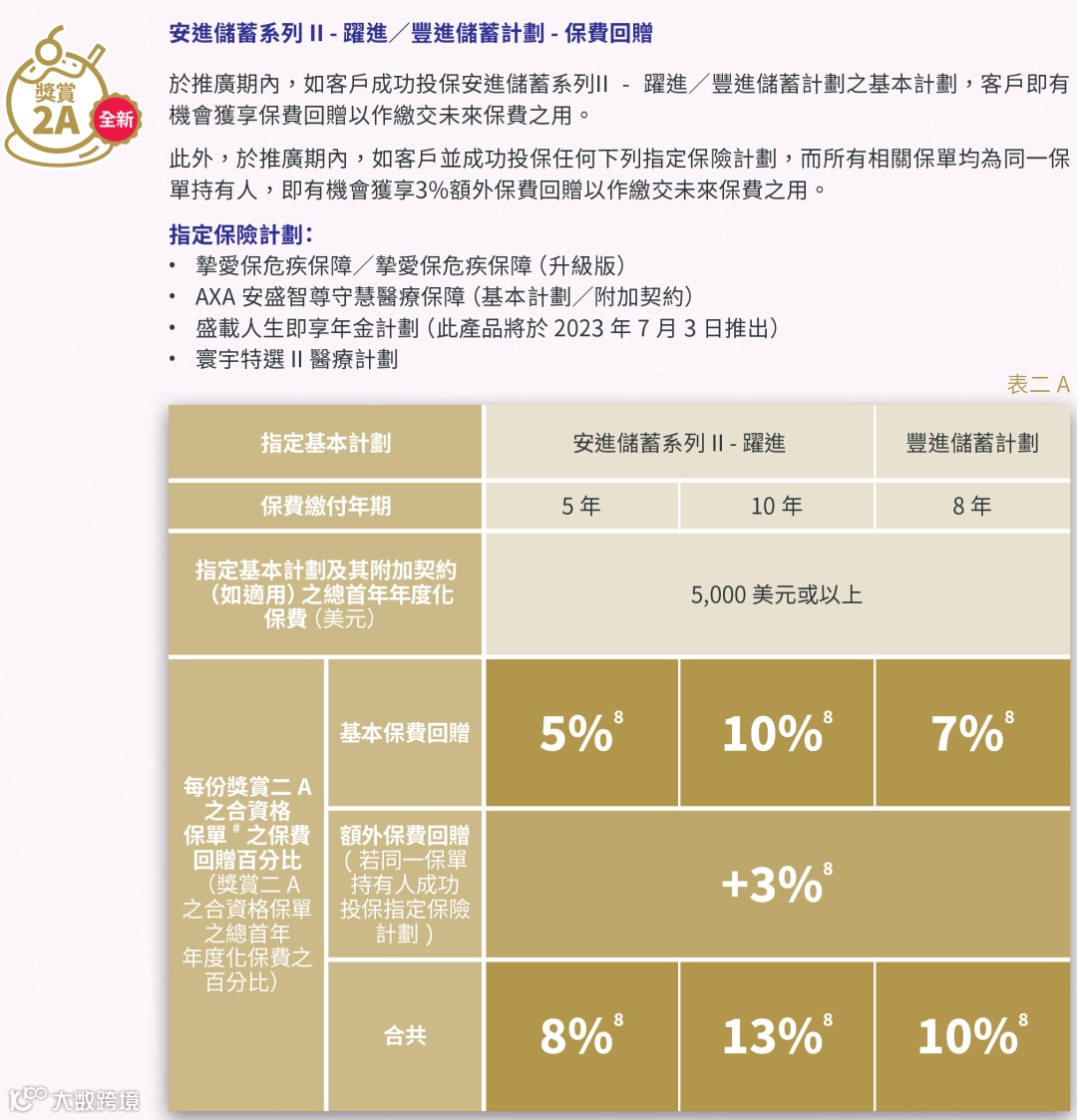 优惠:「安进II-跃进」5年缴高达8%保费回赠、10年缴高达13%保费回赠;「丰进」8年缴高达10%保费回赠。