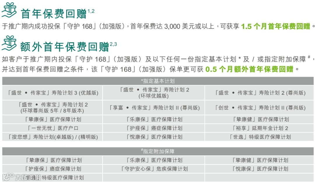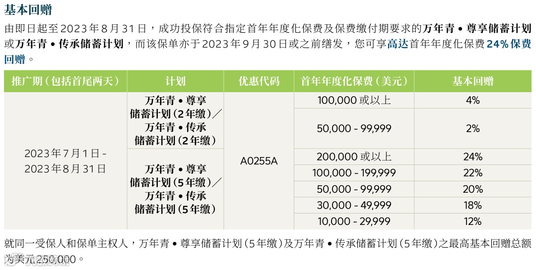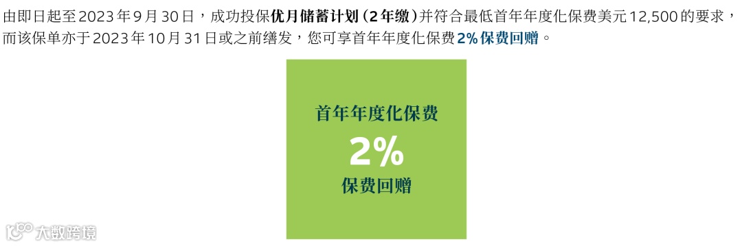 保费回赠:投保「优月储蓄计划(2年缴)」,首年年度化保费达12,500美元,享2%保费回赠优惠;
