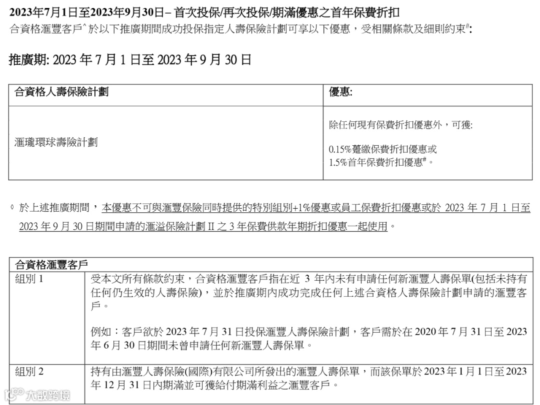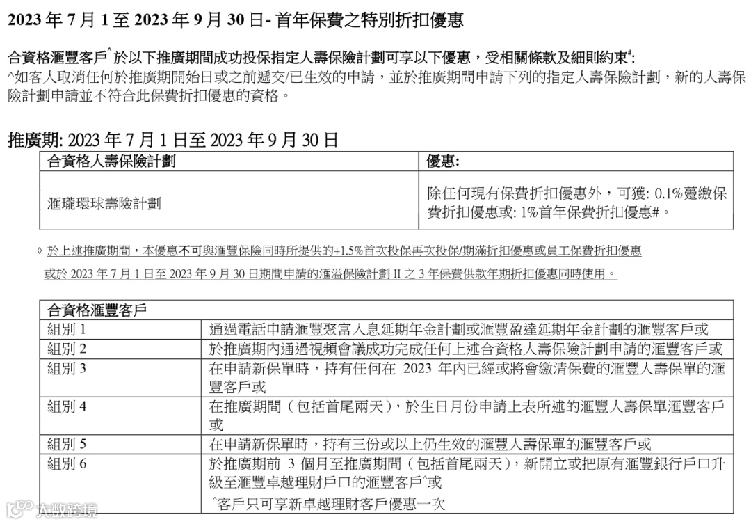 以下合资格汇丰客户投保「汇珑环球寿险计划 」,额外享0.1%(趸缴)或1%(期缴)保费折扣优惠。
