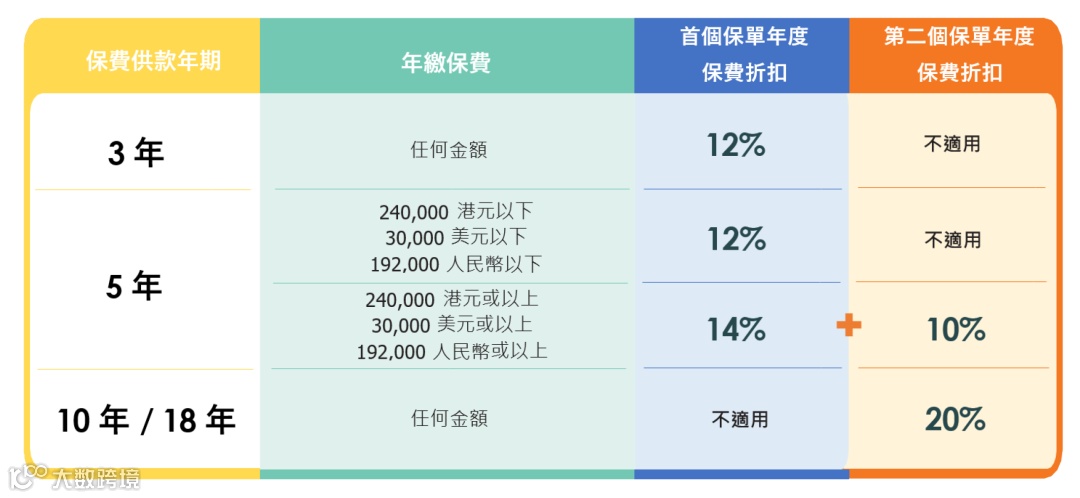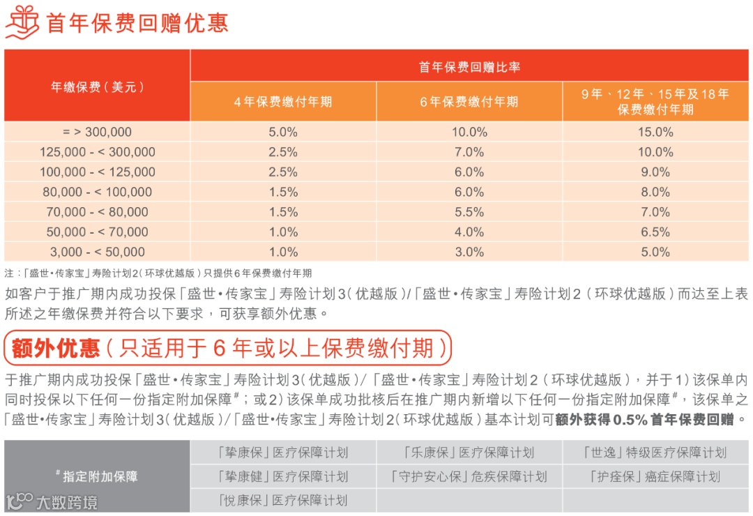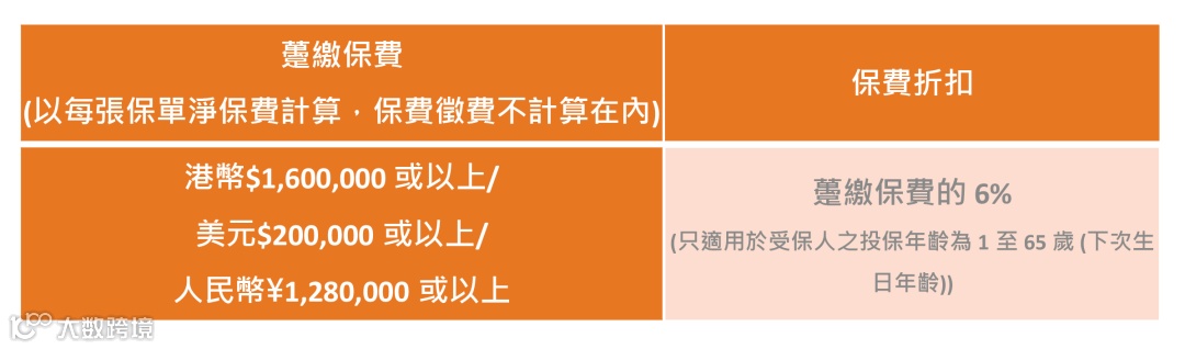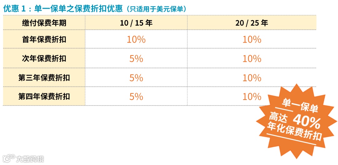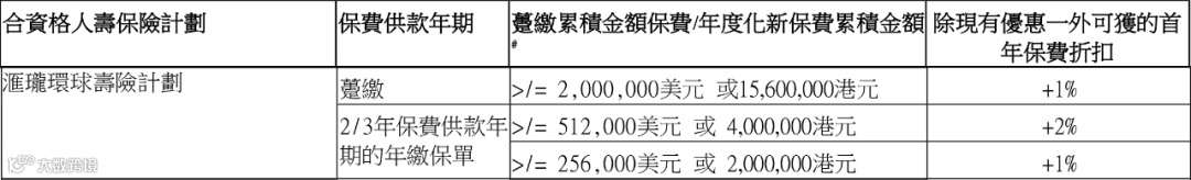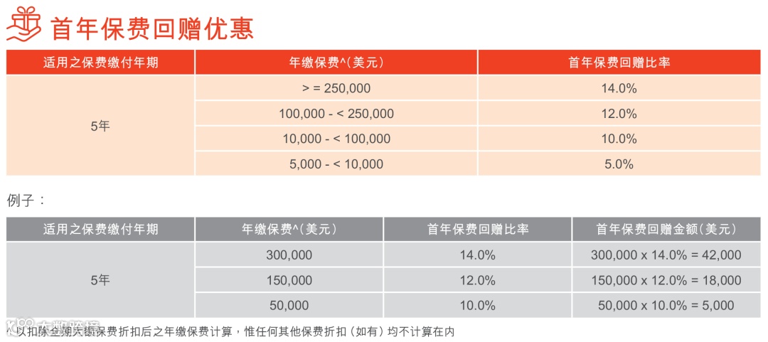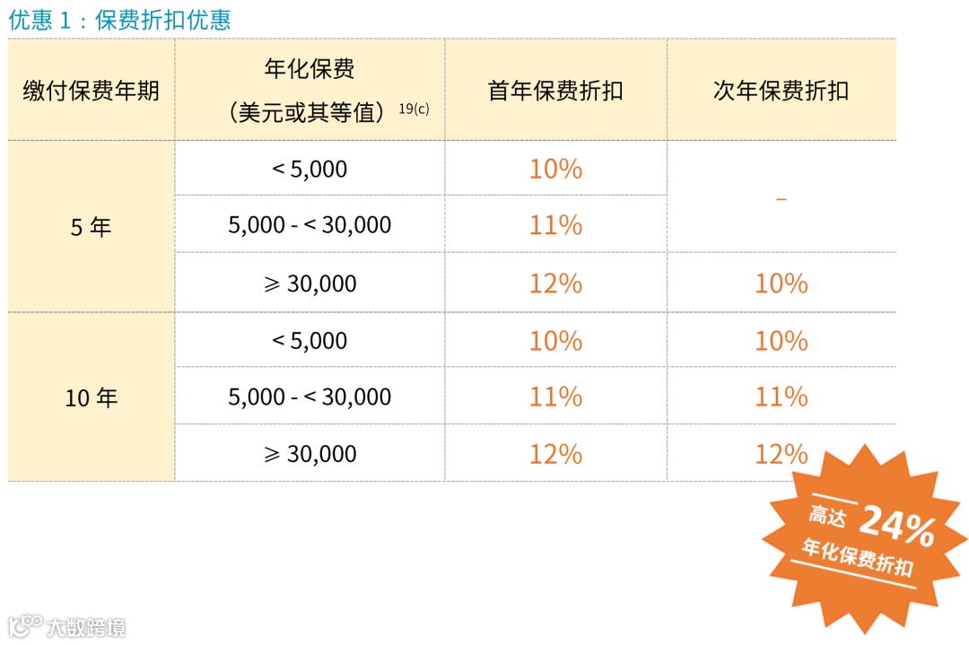 如果投保金额超过一定金额(2/3年缴,每年保费≥256,000美元),额外享1%-2%首年保费折扣。