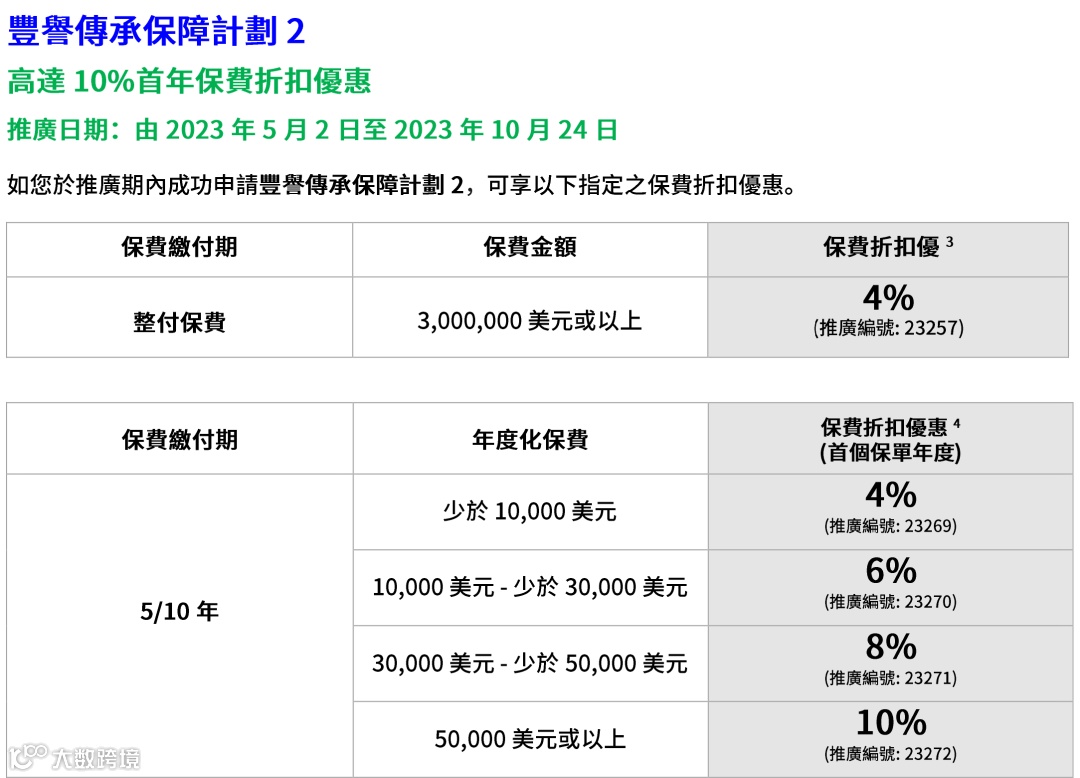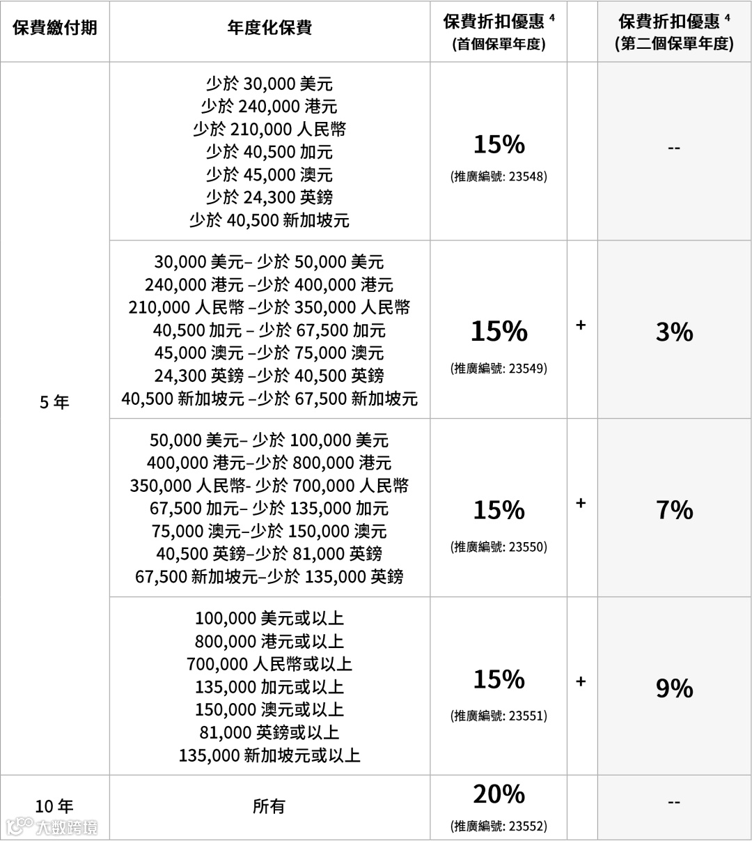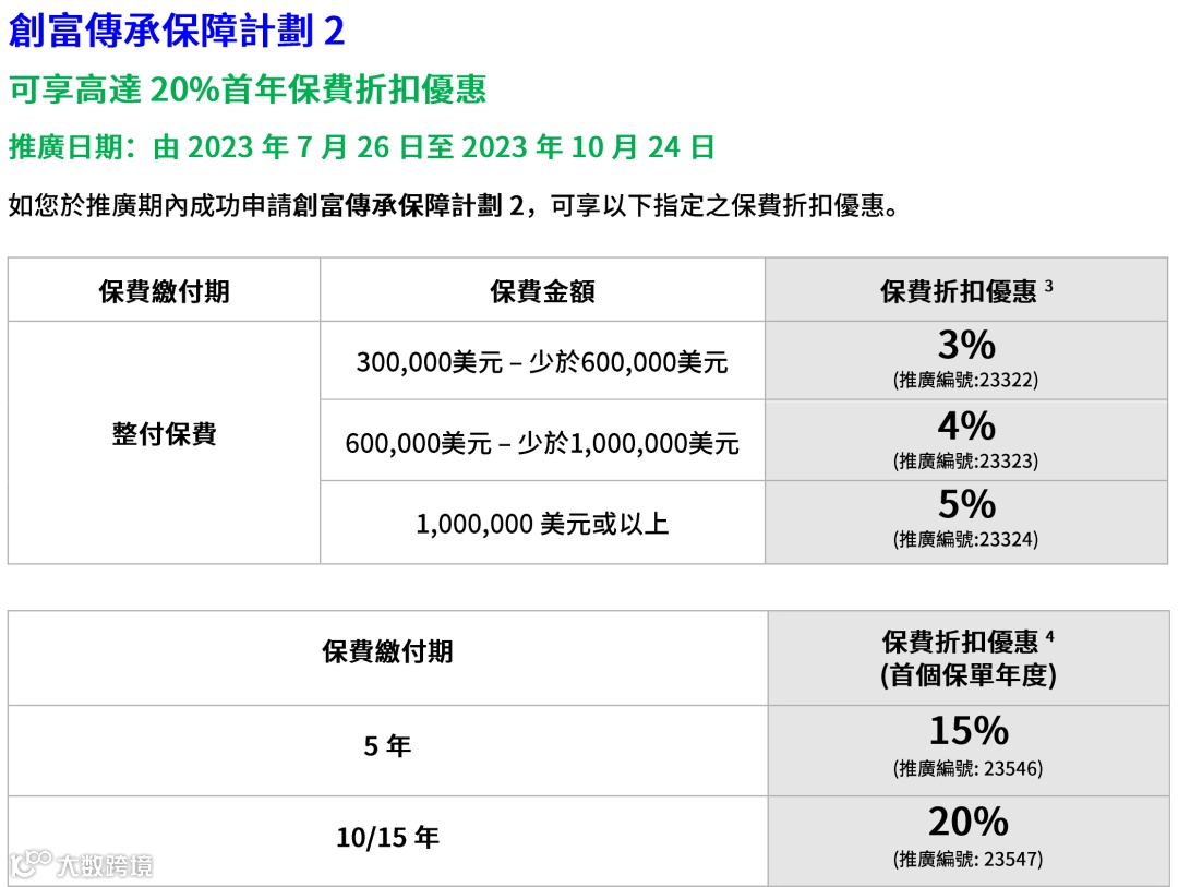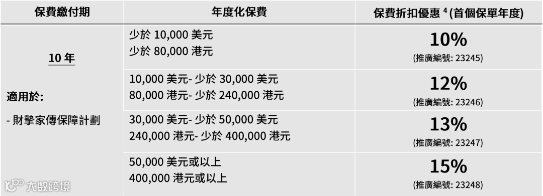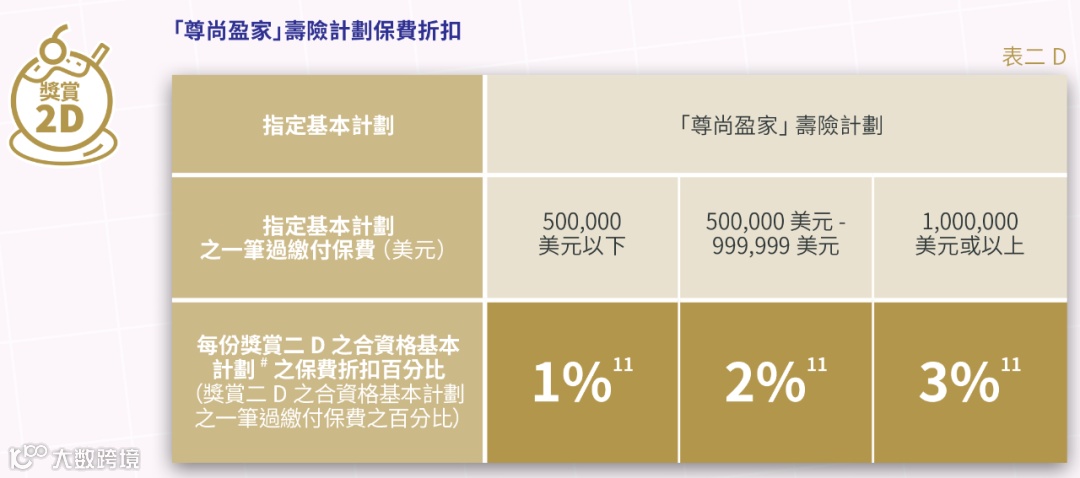 如果投保金额超过一定金额(2/3年缴,每年保费≥256,000美元),额外享1%-2%首年保费折扣。