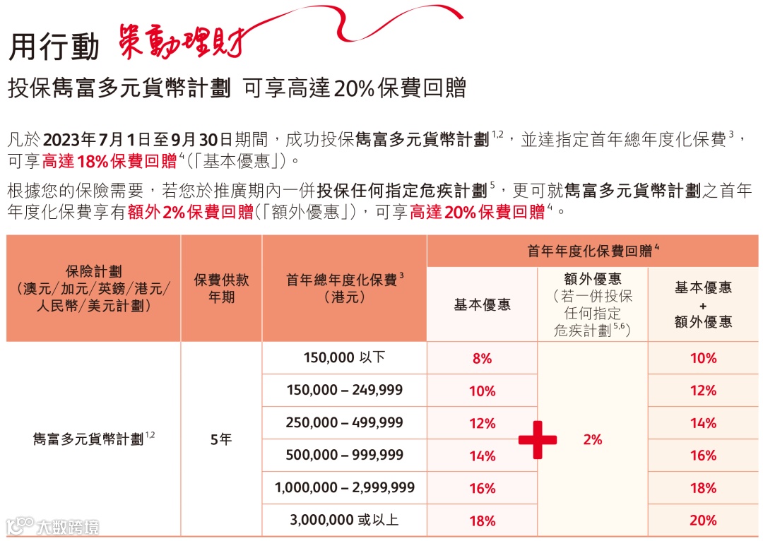 优惠:单独投保「隽富(5年)」,可享高达18%保费回赠;同时投保储蓄险「隽富」和危疾「危疾加护保3/危疾首护保2/诚保一生」,额外多2%保费回赠,享高达20%保费回赠。