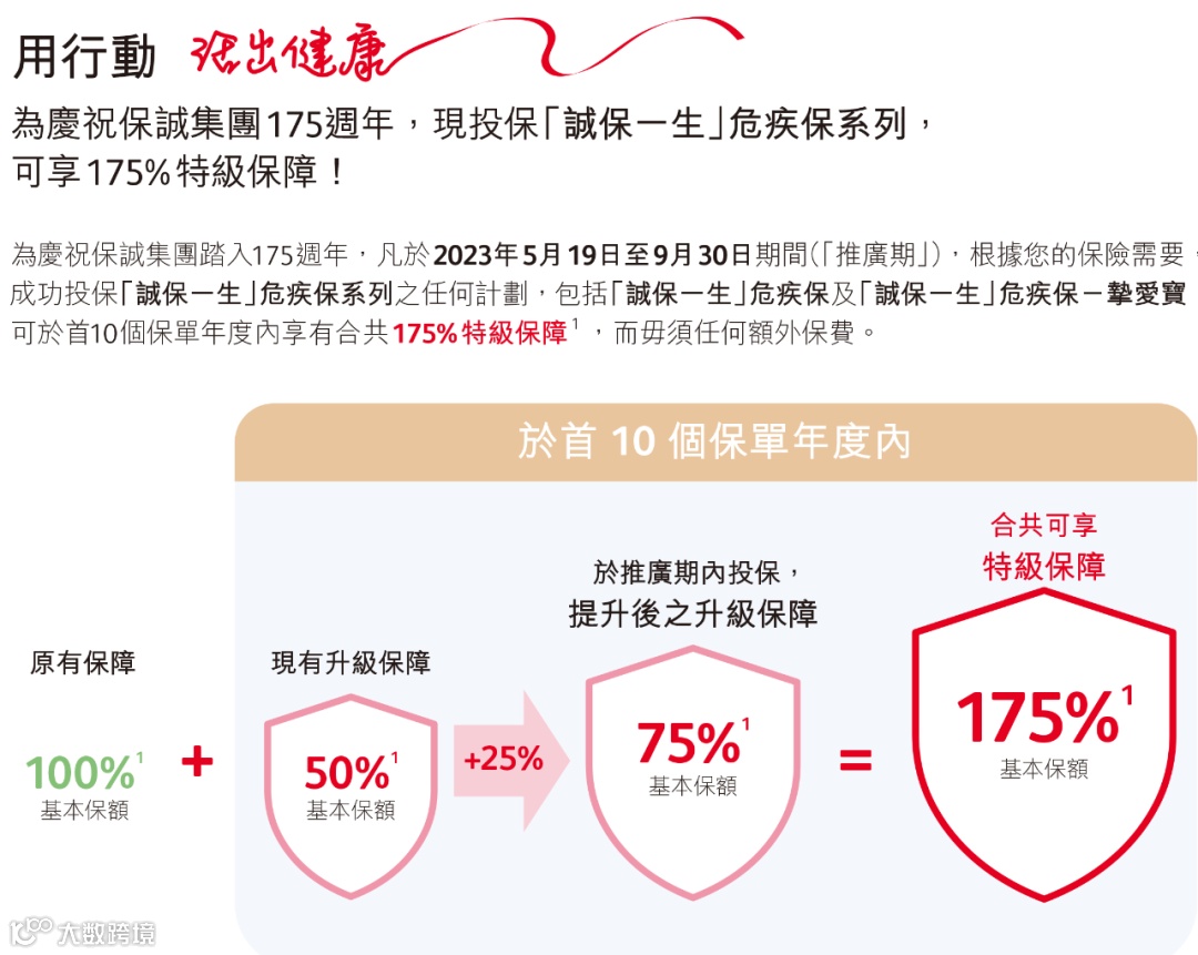 「诚保一生」首10年升级保额至175%。