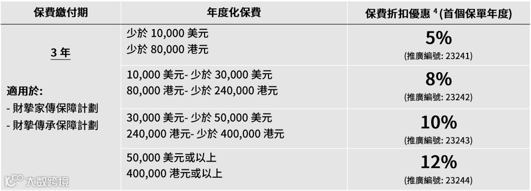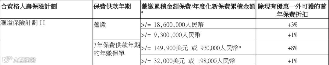 如果投保金额超过一定金额(3年缴,每年保费≥32,000美元;趸缴,保费≥930万人民币),额外享1%-8%首年保费折扣。