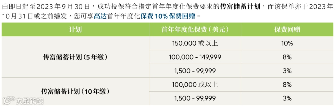 保费回赠优惠:2023年9月30日前,投保「传富储蓄计划」并于10月31日或之前缮发,享高达10%保费回赠。