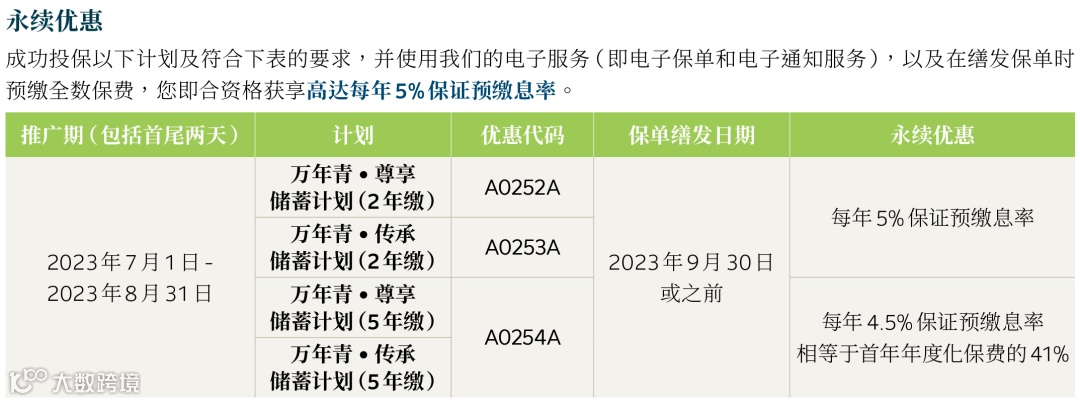 永明预缴4.5%保证利息优惠延长1个月,「万年青」保费回赠优惠不变,8月31日截止。