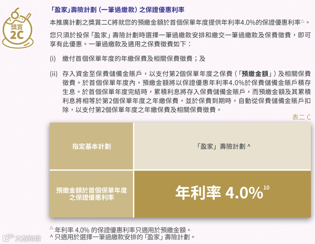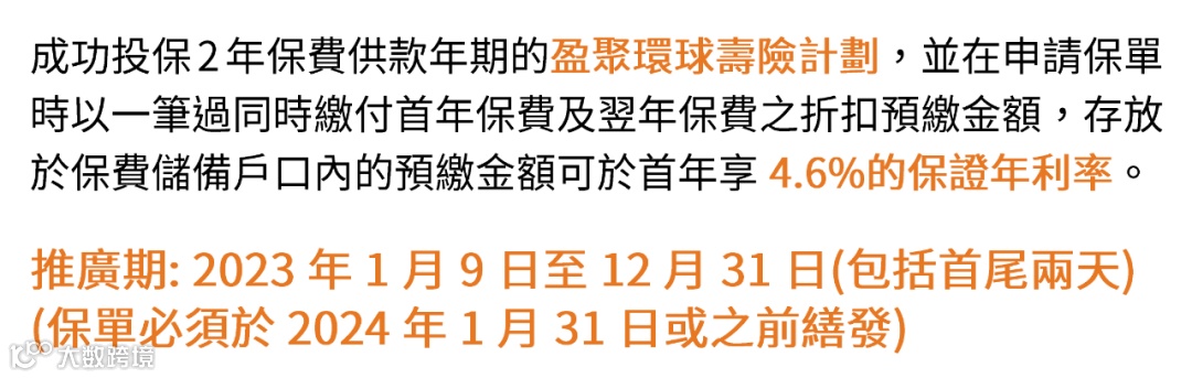 优惠:成功投保2年缴「盈聚环球」并预缴保费,享4.6%保证年利率。