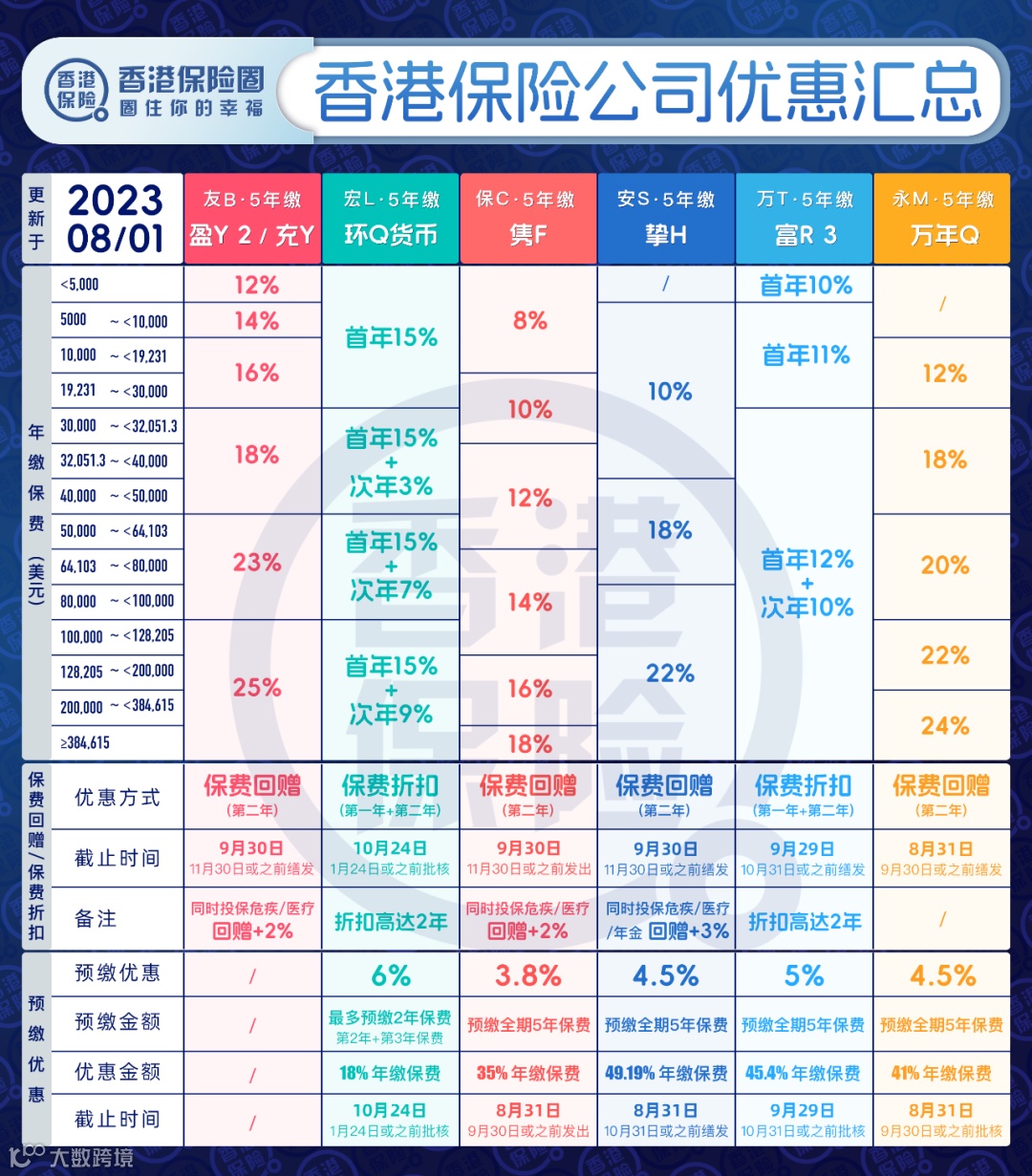 友邦优惠持续:友邦7月初上调优惠,三季度优惠加码,8月优惠不变。「盈御2」(5年缴)保费回赠高达25%;「盈御2+爱伴航」组合优惠,「盈御2」保费回赠+2%,「爱伴航」保费回赠额外送4个月;