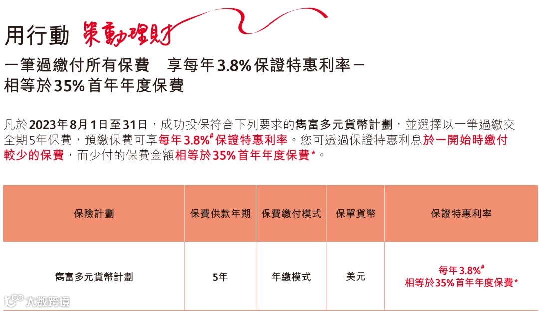 优惠:一笔过缴交5年保费,可享3.8%保证特惠利率,相当于35%首年保费。